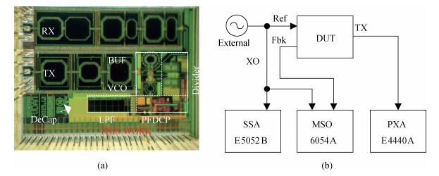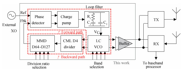 A monolithic K-band phase-locked loop (PLL) for microwave radar application is proposed and implemented in this paper. By eliminating the tail transistor and using optimized high-Q LC-tank, the proposed voltage-controlled oscillator (VCO) achieves a tuning range of 18.4 to 23.3 GHz and reduced phase noise. Two cascaded current-mode logic (CML) divide-by-two frequency prescalers are implemented to bridge the frequency gap, in which inductor peaking technique is used in the first stage to further boost allowable input frequency. Six-stage TSPC divider chain is used to provide programmable division ratio from 64 to 127, and a second-order passive loop filter with 825 kHz bandwidth is also integrated on-chip to minimize required external components. The proposed PLL needs only approximately 18.2 μs settling time, and achieves a wide tuning range from 18.4 to 23.3 GHz, with a typical output power of -0.84 dBm and phase noise of 91:92 dBc/Hz@1 MHz. The chip is implemented in TSMC 65 nm CMOS process, and occupies an area of 0.56 mm2 without pads under a 1.2 V single voltage supply.