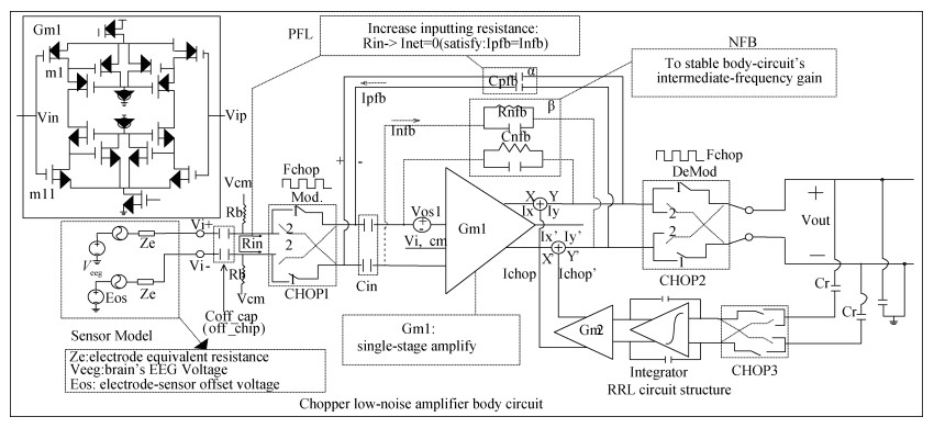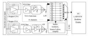 Facing the body's EEG (electroencephalograph, 0.5-100Hz, 5-100 μV) and ECG's (electrocardiogram, < 100Hz, 0.01-5mV) micro signal detection requirement, this paper develops a pervasive application micro signal detection ASIC chip with the chopping modulation/demodulation method. The chopper-stabilization circuit with the RRL (ripple reduction loop) circuit is to suppress the ripple voltage, which locates at the single-stage amplifier's outputting terminal. The single-stage chopping core's noise has been suppressed too, and it is beneficial for suppressing noises of post-circuit. The chopping core circuit uses the PFB (positive feedback loop) to increase the inputting resistance, and the NFB (negative feedback loop) to stabilize the 40 dB intermediate frequency gain. The cascaded switch-capacitor sample/hold circuit has been used for deleting spike noises caused by non-ideal MOS switches, and the VGA/BPF (voltage gain amplifier/band pass filter) circuit is used to tune the chopper system's gain/bandwidth digitally. Assisted with the designed novel dry-electrode, the real test result of the chopping amplifying circuit gives some critical parameters:8.1 μW/channel, 0.8 μVrms (@band-width=100 Hz), 4216-11220 times digitally tuning gain range, etc. The data capture system uses the NI CO's data capturing DAQmx interface, and the captured micro EEG/ECG's waves are real-time displayed with the PC-Labview. The proposed chopper system is a unified EEG/ECG signal's detection instrument and has a critical real application value.