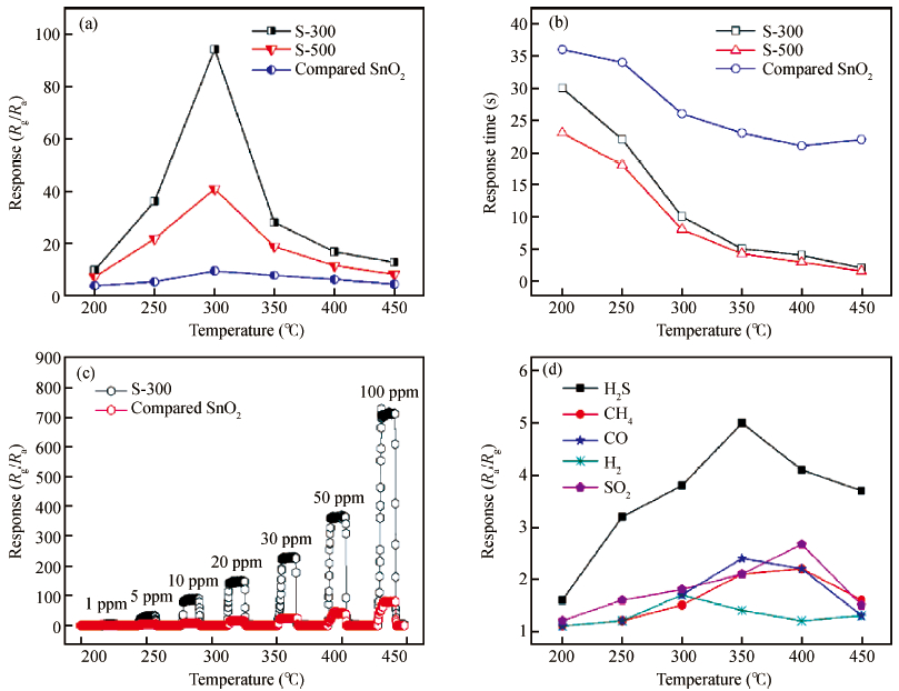Mesoporous tin oxide(SnO2/with a high surface area of 147.5 m2/g has been successfully synthesized via self-assembly process, combining the driven forces of water-evaporation and molecular interactions. Scanning electron microscope, X-ray diffraction, transmission electron micrograph, Fourier transform infrared and BrunauerEmmett-Teller were employed to analyze the morphology and crystal structure of the as-synthesized mesoporous materials. As a gas sensor, mesoporous SnO2 shows impressive performances towards NOx gas with high selectivity and stability as well as ultra high sensitivity about 94.3 to 10 ppm NOx gas at 300℃. The best response time of the sample S-500 is about 3.4s to 10 ppm NOx at 450℃.
