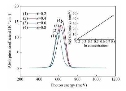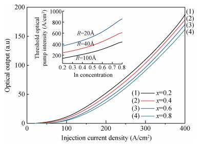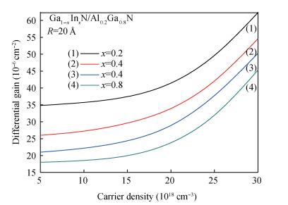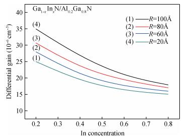 Electronic and optical properties are obtained with the increase in indium alloy content (x) in a Ga1-xInxN/Al0.2Ga0.8N quantum dot. The barrier height with the different In alloy contents is applied to acquire the confinement potentials. The results are obtained taking into consideration geometrical confinement effect. The optical absorption coefficient with the photon energy is observed in a Ga1-xInxN/Al0.2Ga0.8N quantum dot. The optical output with the injection current density and the threshold optical pump intensity for various In alloy contents are studied. The differential gain as functions of indium alloy content, charge density and the dot radii in the Ga1-xInxN/Al0.2Ga0.8N quantum dot are investigated. The exciton binding energy is calculated in order to obtain the exciton density, the optical gain and the threshold current density in the Ga1-xInxN/Al0.2In0.8N quantum dot. The results show that the red shift energy with an increase in In alloy content is found and the differential gain increases with the charge carrier density.