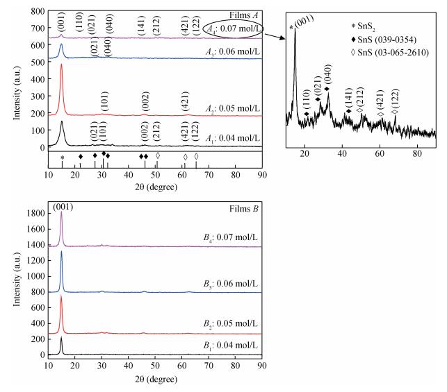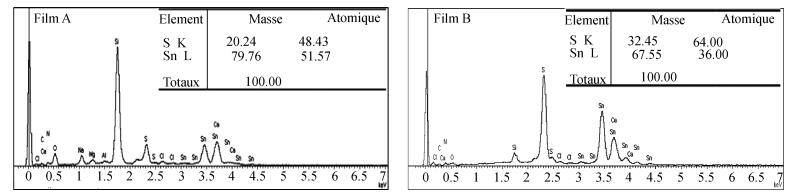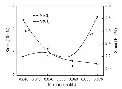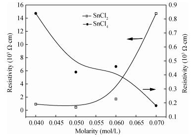 Thin films of SnSx, semiconductors, have been successfully synthesized by ultrasonic spray pyrolysis technique, using two precursors namely:tin (Ⅱ) chloride and tin (Ⅳ) chloride, respectively. The solutions were prepared by the dilution of different Sn molarities of the two precursors separately. The precursor molarities were varied from 0.04 to 0.07 mol/L, whereas that of S was fixed at 0.1 mol/L. The present work focuses on the effect of the different precursor's molarities on the nature and the properties of the prepared thin films in order to optimize the growth conditions. X-ray diffraction analysis reveals that the precursor's molarities alter the grain size of the prepared films, which varied from 8 to 14 nm and from 12 to 16 nm, according to the used precursor. The films analysis by SEM, shows that the SnS2 films are more dense and smooth than the SnS films. The composition of the elements is analysed with an EDX spectrometer, and the obtained result for Msn D 0:07 mol/L indicates that the atomic ratio of Sn to S is 51.57:48.43 and 36:64 for films synthesized from the first and second precursors respectively. Electrical measurements show that the conductivity behavior depends on the used precursors and their molarities.