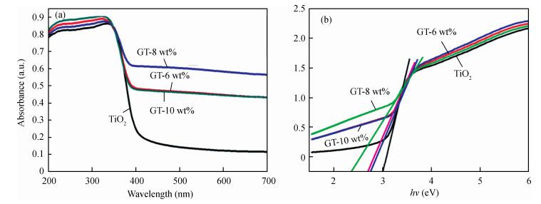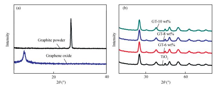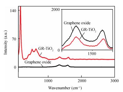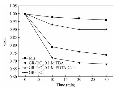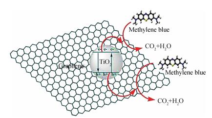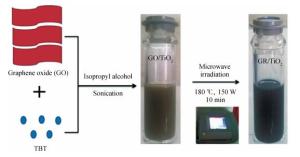 In this paper an improvement in the photocatalytic performance of TiO2 was carried out via hybridizing with graphene. Graphene-TiO2 (GR-TiO2)nanocomposites with different weight addition ratios of graphene oxide (GO) have been prepared via a facile microwave irradiation of GO and tetrabutyl titanate in isopropyl alcohol. Raman spectroscopy (RS), X-ray diffraction (XRD), scanning electron microscopy (SEM), transmission electron microscopy (TEM), UV-visible spectroscopy (UV-vis), Fourier transform infrared spectra (FTIR), energy dispersive X-ray spectroscopy (EDX) and photoluminescence spectra (PL) are employed to determine the properties of the samples. Microwave irradiation can heat the reactant to a higher temperature in a short time, simultaneously GO is reduced to graphene and TiO2 nanoparticles grown on the surface of GR. GR-TiO2 nanocomposites synthesized via this approach have efficient electron conductivity in GR, resulting in a reduced electron-hole recombination rate. Among the synthesized nanocomposites, GT-8wt% exhibited the best photocatalytic activity toward photocatalytic degradation of MB. Our current work provides a new insight for the fabrication of GR-TiO2 nanocomposites within a short reaction time and also explains the mechanism of photocatalysis employing radical and hole scavengers.