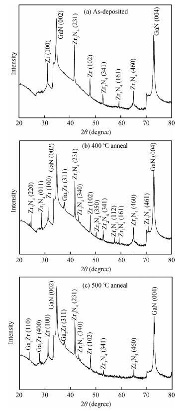 The Schottky barrier junction parameters and structural properties of Zr/p-GaN Schottky diode are explored at various annealing temperatures. Experimental analysis showed that the barrier height (BH) of the Zr/pGaN Schottky diode increases with annealing at 400℃ (0.92 eV (I-V)/1.09 eV (C-V)compared to the asdeposited one (0.83 eV (I-V)/0.93 eV (C-V). However, the BH decreases after annealing at 500℃. Also, at different annealing temperatures, the series resistance and BH are assessed by Cheung's functions and their values compared. Further, the interface state density (NSS)of the diode decreases after annealing at 400℃ and then somewhat rises upon annealing at 500℃. Analysis reveals that the maximum BH is obtained at 400℃, and thus the optimum annealing temperature is 400℃ for the diode. The XPS and XRD analysis revealed that the increase in BH may be attributed to the creation of Zr-N phases with increasing annealing up to 400℃. The BH reduces for the diode annealed at 500℃, which may be due to the formation of Ga-Zr phases at the junction. The AFM measurements reveal that the overall surface roughness of the Zr film is quite smooth during rapid annealing process.