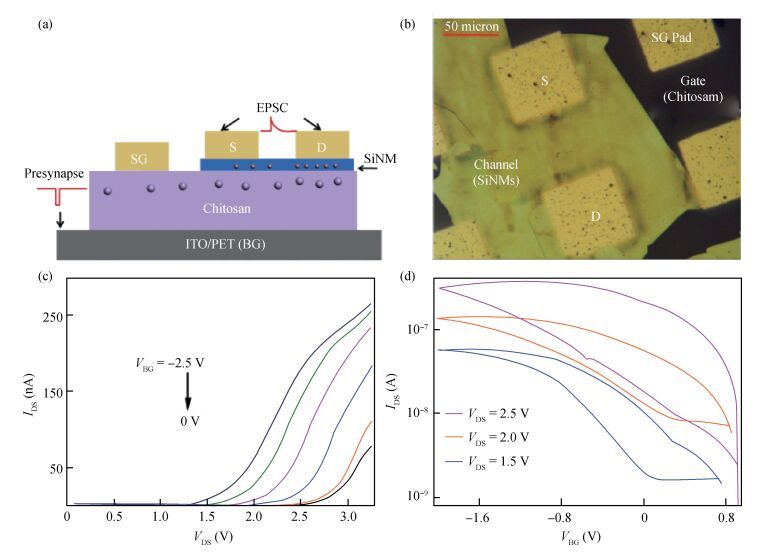 Silicon nanomembrane (SiNM) transistors gated by chitosan membrane were fabricated on plastic substrate to mimic synapse behaviors. The device has both a bottom proton gate (BG) and multiple side gates (SG). Electrical transfer properties of BG show hysteresis curves different from those of typical SiO2 gate dielectric. Synaptic behaviors and functions by linear accumulation and release of protons have been mimicked on this device:excitatory post-synaptic current (EPSC) and paired pulse facilitation behavior of biological synapses were mimicked and the paired-pulse facilitation index could be effectively tuned by the spike interval applied on the BG. Synaptic behaviors and functions, including short-term memory and long-term memory, were also experimentally demonstrated in BG mode. Meanwhile, spiking logic operation and logic modulation were realized in SG mode.