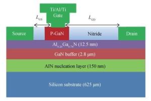 An enhancement mode p-GaN gate AlGaN/GaN HEMT is proposed and a physics based virtual source charge model with Landauer approach for electron transport has been developed using Verilog-A and simulated using Cadence Spectre, in order to predict device characteristics such as threshold voltage, drain current and gate capacitance. The drain current model incorporates important physical effects such as velocity saturation, short channel effects like DIBL (drain induced barrier lowering), channel length modulation (CLM), and mobility degradation due to self-heating. The predicted Id-Vds, Id-Vgs, and C-V characteristics show an excellent agreement with the experimental data for both drain current and capacitance which validate the model. The developed model was then utilized to design and simulate a single-pole single-throw (SPST) RF switch.