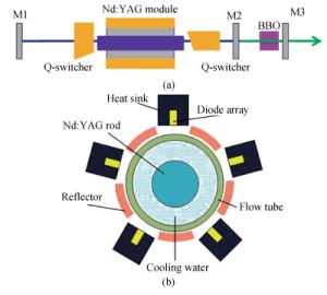 A simple and compact linear resonator green laser at 532 nm is generated by intracavity frequencydoubling of a diode-side-pumped acousto-optically (AO) Q-switched Nd:YAG laser at 1064 nm. Two acoustooptic Q-switches were placed orthogonally with each other to improve the hold-off capacity. As high as 214 W of continuous-wave (CW) and 154 W of quasi-continuous-wave (QCW) output power at 1064 nm were obtained when the pumping power was 1598 W. The type Ⅰ phase-matched BBO crystal was used as the nonlinear medium in the second harmonic generation. A green laser with an average output power of 37 W was obtained at a repetition rate of 20 kHz and a pulse width of 54 ns, which corresponds to pulse energy of 1.85 mJ per pulse and a peak power 34.26 kW, respectively.