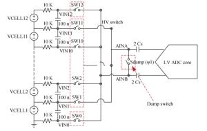 For stacked battery monitoring IC high speed and high precision voltage acquisition requirements, this paper introduces a kind of symmetrical type high voltage switch circuit. This kind of switch circuit uses the voltage following structure, which eliminates the leakage path of input signals. At the same time, this circuit adopts a high speed charge pump structure, in any case the input signal voltage is higher than the supply voltage, it can fast and accurately turn on high voltage MOS devices, and convert the battery voltage to an analog to digital converter. The proposed high voltage full symmetry switch has been implemented in a 0.18μm BCD process; simulated and measured results show that the proposed switch can always work properly regardless of the polarity of the voltage difference between the input signal ports and an input signal higher than the power supply.