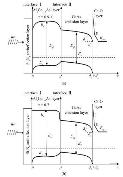 We designed two transmission-mode GaAs/AlGaAs photocathodes with different AlxGa1-xAs layers, one has an AlxGa1-xAs layer with the Al component ranging from 0.9 to 0, and the other has a fixed Al component 0.7. Using the first-principle method, we calculated the electronic structure and absorption spectrum of AlxGa1-xAs at x=0, 0.25, 0.5, 0.75 and 1, calculation results suggest that with the increase of the Al component, the band gap of AlxGa1-xAs increases. Then we activated the two samples, and obtained the spectral response curves and quantum efficiency curves; it is found that sample 1 has a better shortwave response and higher quantum efficiency at short wavelengths. Combined with the band structure diagram of the transmission-mode GaAs/AlGaAs photocathode and the fitted performance parameters, we analyze the phenomenon. It is found that the transmission-mode GaAs/AlGaAs photocathode with variable Al component and various doping structure can form a two-stage built-in electric field, which improves the probability of shortwave response photoelectrons escaping to the vacuum. In conclusion, such a structure reduces the influence of back-interface recombination, improves the shortwave response of the transmission-mode photocathode.