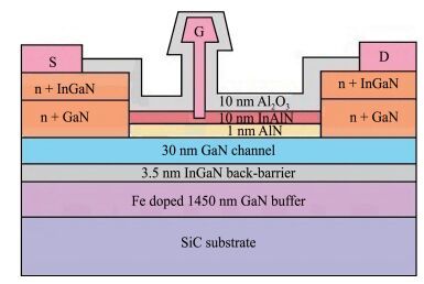 The DC and RF performance of 30 nm gate length enhancement mode (E-mode) InAlN/AlN/GaN high electron mobility transistor (HEMT) on SiC substrate with heavily doped source and drain region have been investigated using the Synopsys TCAD tool. The proposed device has the features of a recessed T-gate structure, InGaN back barrier and Al2O3 passivated device surface. The proposed HEMT exhibits a maximum drain current density of 2.1 A/mm, transconductance gm of 1050 mS/mm, current gain cut-off frequency ft of 350 GHz and power gain cut-off frequency fmax of 340 GHz. At room temperature the measured carrier mobility (μ), sheet charge carrier density (ns) and breakdown voltage are 1580 cm2/(V·s), 1.9×1013 cm-2, and 10.7 V respectively. The superlatives of the proposed HEMTs are bewitching competitor or future sub-millimeter wave high power RF VLSI circuit applications.