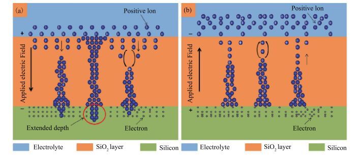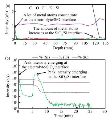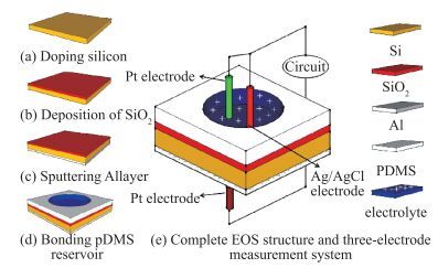 The resistive switching characteristic of SiO2 thin film in electrolyte-oxide-semiconductor (EOS) structures under certain bias voltage is reported. To analyze the mechanism of the resistive switching characteristic, a batch of EOS structures were fabricated under various conditions and their electrical properties were measured with a set of three-electrode systems. A theoretical model based on the formation and rupture of conductive filaments in the oxide layer is proposed to reveal the mechanism of the resistive switching characteristic, followed by an experimental investigation of Auger electron spectroscopy (AES) and secondary ion mass spectroscopy (SIMS) to verify the proposed theoretical model. It is found that different threshold voltage, reverse leakage current and slope value features of the switching I-V characteristic can be observed in different EOS structures with different electrolyte solutions as well as different SiO2 layers made by different fabrication processes or in different thicknesses. With a simple fabrication process and significant resistive switching characteristic, the EOS structures show great potential for chemical/biochemical applications.