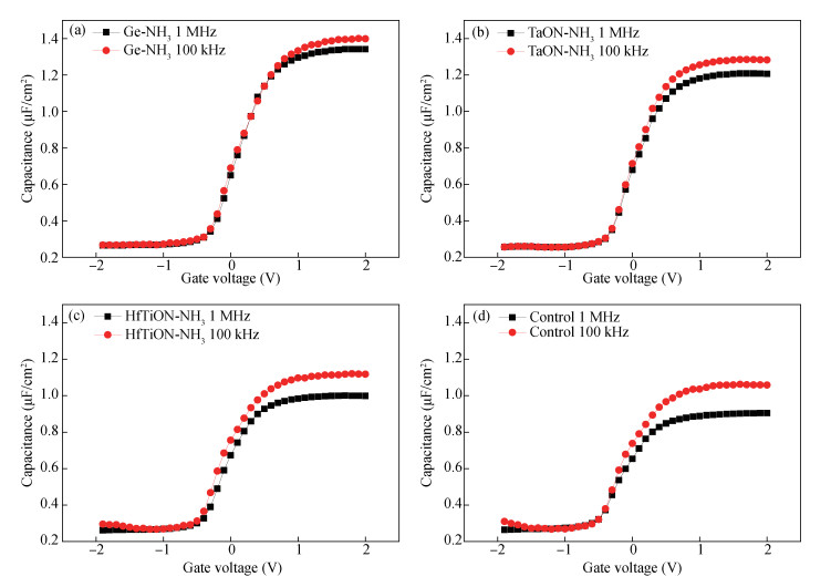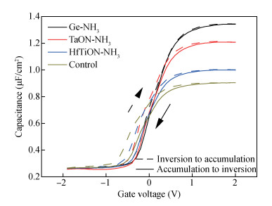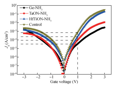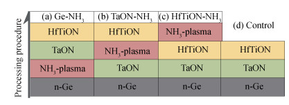 The effects of different NH3-plasma treatment procedures on interfacial and electrical properties of Ge MOS capacitors with stacked gate dielectric of HfTiON/TaON were investigated. The NH3-plasma treatment was performed at different steps during fabrication of the stacked gate dielectric, i.e. before or after interlayer (TaON) deposition, or after deposition of high-k dielectric (HfTiON). It was found that the excellent interface quality with an interface-state density of 4.79×1011 eV-1cm-2 and low gate leakage current (3.43×10-5A/cm2 at Vg=1 V) could be achieved for the sample with NH3-plasma treatment directly on the Ge surface before TaON deposition. The involved mechanisms are attributed to the fact that the NH3-plasma can directly react with the Ge surface to form more Ge-N bonds, i.e. more GeOxNy, which effectively blocks the inter-diffusion of elements and suppresses the formation of unstable GeOx interfacial layer, and also passivates oxygen vacancies and dangling bonds near/at the interface due to more N incorporation and decomposed H atoms from the NH3-plasma.
