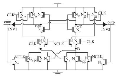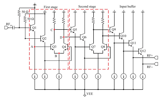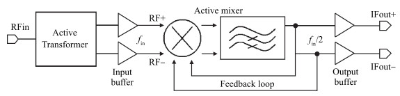 This letter presents a high speed 2:1 regenerative dynamic frequency divider with an active transformer fabricated in 0.7 μm InP DHBT technology with fT of 165 GHz and fmax of 230 GHz. The circuit includes a two-stage active transformer, input buffer, divider core and output buffer. The core part of the frequency divider is composed of a double-balanced active mixer (widely known as the Gilbert cell) and a regenerative feedback loop. The active transformer with two stages can contribute to positive gain and greatly improve phase difference. Instead of the passive transformer, the active one occupies a much smaller chip area. The area of the chip is only 469×414 μm2 and it entirely consumes a total DC power of only 94.6 mW from a single -4.8 V DC supply. The measured results present that the divider achieves an operating frequency bandwidth from 75 to 80 GHz, and performs a -23 dBm maximum output power at 37.5 GHz with a 0 dBm input signal of 75 GHz.