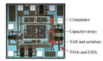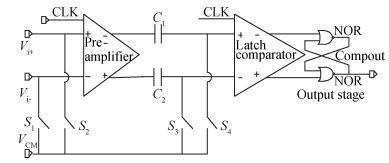 This paper presents a low power 8-bit 1 MS/s SAR ADC with 7.72-bit ENOB. Without an op-amp, an improved segmented capacitor DAC is proposed to reduce the capacitance and the chip area. A dynamic latch comparator with output offset voltage storage technology is used to improve the precision. Adding an extra positive feedback in the latch is to increase the speed. What is more, two pairs of CMOS switches are utilized to eliminate the kickback noise introduced by the latch. The proposed SAR ADC was fabricated in SMIC 0.18 μm CMOS technology. The measured results show that this design achieves an SFDR of 61.8 dB and an ENOB of 7.72 bits, and it consumes 67.5 μ W with the FOM of 312 fJ/conversion-step at 1 MS/s sample under 1.8 V power supply.