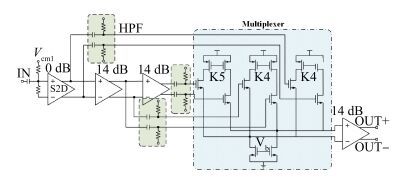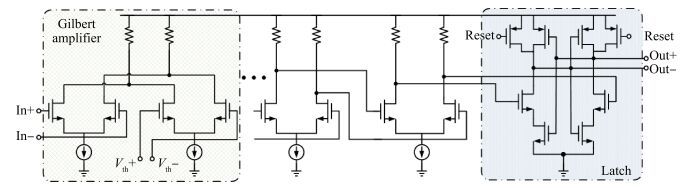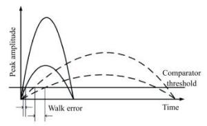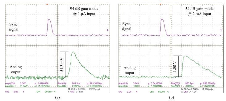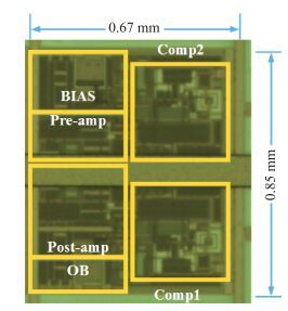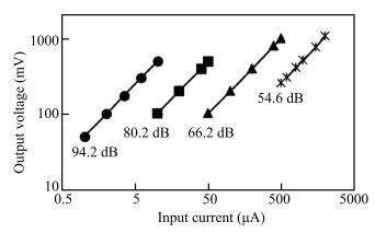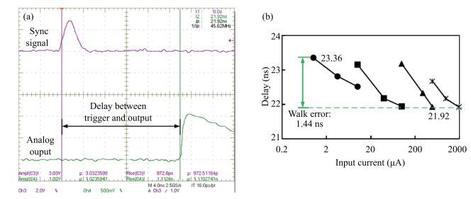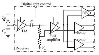 This study presents a CMOS receiver chip realized in 0.18 μm standard CMOS technology and intended for high precision 3-D laser radar. The chip includes an adjustable gain transimpedance pre-amplifier, a post-amplifier and two timing comparators. An additional feedback is employed in the regulated cascode transimpedance amplifier to decrease the input impedance, and a variable gain transimpedance amplifier controlled by digital switches and analog multiplexer is utilized to realize four gain modes, extending the input dynamic range. The measurement shows that the highest transimpedance of the channel is 50 kΩ, the uncompensated walk error is 1.44 ns in a wide linear dynamic range of 66 dB (1:2000), and the input referred noise current is 2.3 pA/$\sqrt {{\rm{Hz}}} $ (rms), resulting in a very low detectable input current of 1 μ A with SNR=5.