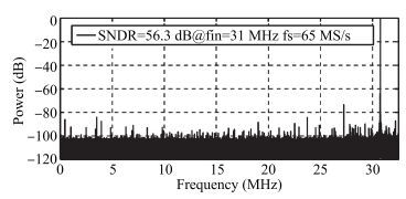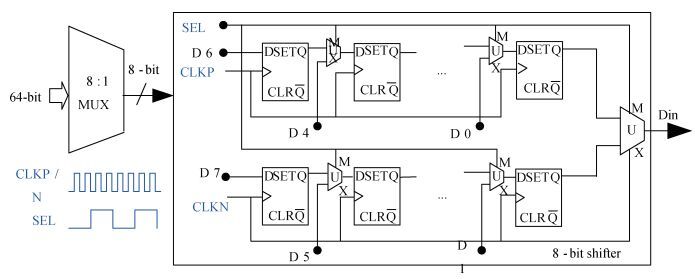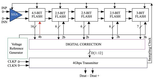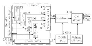 A 4 Gbps transmitter for a 12-bit 250 MSPS pipelined ADCs is presented. A low power current mode (CM) output driver with reverse scaling technique is proposed. A high speed, low power combined serializer is implemented to convert 12 bit parallel data into a seria1 data stream. The whole transmitter is used in a 12-bit 250 MSPS pipelined ADC for the digital output buffer and fabricated in 180 nm 1. 8 V 1P5M CMOS technology. Test results show that the transmitter provides an eye height greater than 800 mV for data rates of both 2 Gbps and 4 Gbps, the 12-bit 250 MSPS ADC achieves the SNR of 69.92 dBFS and SFDR of 81.17 dB with 20.1 MHz input at full sampling speed. The ADC with the 4 Gbps transmitter consumes the power consumption of 395 mW, where the power consumption of transmitter is 75 mW. The ADC occupies an area of 2.5×3.2 mm2, where the active area of the transmitter block is 0.5×1.2 mm2.