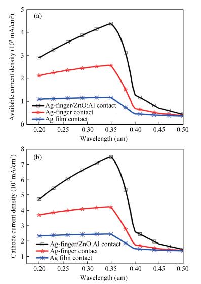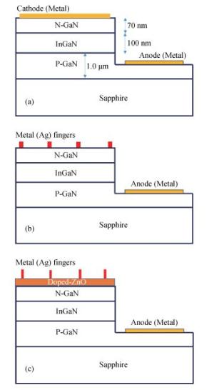 The effect of doped-ZnO transparent conductive oxide (TCO) with metal (Ag)-fingers contact on GaN/InGaN solar cell is investigated through numerical simulations. An optical and electrical analysis of different dopant elements (such as B, Al, Ga, In and Sn) with ZnO as a top TCO layer is studied. A comparative analysis of metal square pad electrode, metal grid pattern electrode and metal-finger/ZnO type electrodes are taken into consideration to ensure the effect of anti-reflectivity by ZnO. The effect of thickness of ZnO and i-InGaN layer on performance of solar cell is also studied in detail. The proposed solar cell structure with Ag-fingers/ZnO:Al as top contact electrode shows interesting device characteristics compared to other dopants and metal top electrodes. The device achieves open circuit voltage~2.525 V, short circuit current~4.256 mA/cm2, fill factor~87.86% and efficiency~9.22% under 1 Sun, air mass 1.5 global illumination.