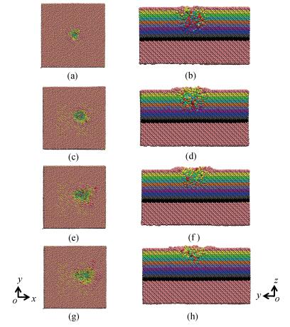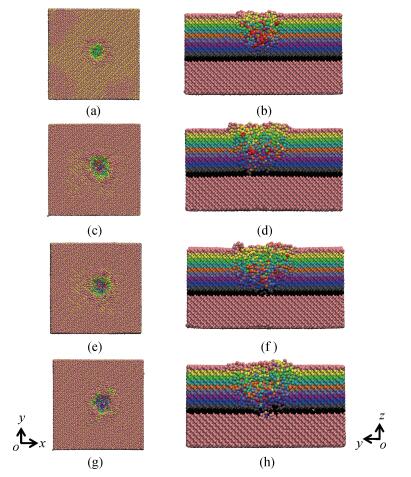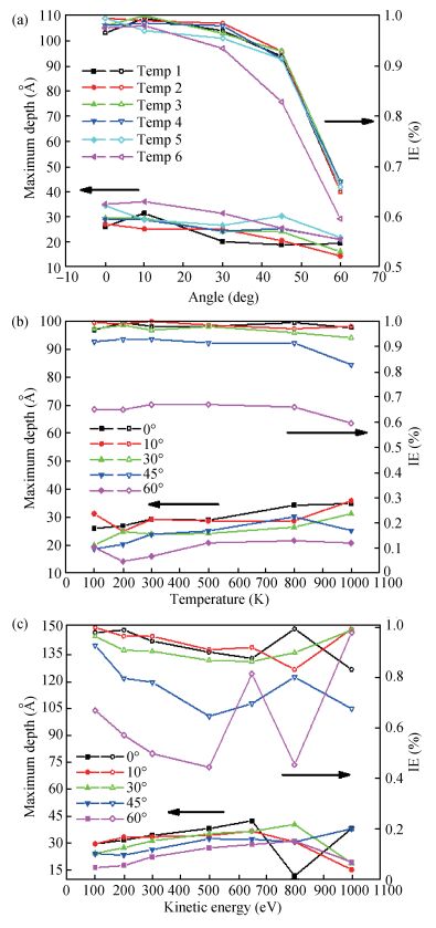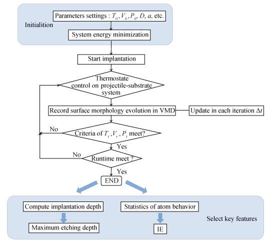 Carbon cluster ion implantation is an important technique in fabricating functional devices at micro/nanoscale. In this work, a numerical model is constructed for implantation and implemented with a cutting-edge molecular dynamics method. A series of simulations with varying incident energies and incident angles is performed for incidence on silicon substrate and correlated effects are compared in detail. Meanwhile, the behavior of the cluster during implantation is also examined under elevated temperatures. By mapping the nanoscopic morphology with variable parameters, numerical formalism is proposed to explain the different impacts on phrase transition and surface pattern formation. Particularly, implantation efficiency (IE) is computed and further used to evaluate the performance of the overall process. The calculated results could be properly adopted as the theoretical basis for designing nano-structures and adjusting devices' properties.