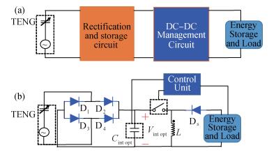 Recently, triboelectric nanogenerators (TENGs), as a collection technology with characteristics of high reliability, high energy density and low cost, has attracted more and more attention. However, the energy coming from TENGs needs to be stored in a storage unit effectively due to its unstable ac output. The traditional energy storage circuit has an extremely low energy storage efficiency for TENGs because of their high internal impedance. This paper presents a new power management circuit used to optimize the energy using efficiency of TENGs, and realize large load capacity. The power management circuit mainly includes rectification storage circuit and DC-DC management circuit. A rotating TENG with maximal energy output of 106 mW at 170 rpm based on PCB is used for the experimental verification. Experimental results show that the power energy transforming to the storage capacitor reach up to 53 mW and the energy using efficiency is calculated as 50%. When different loading resistances range from 0.82 to 34.5 kΩ are connected to the storage capacitor in parallel, the power energy stored in the storage capacitor is all about 52.5 mW. Getting through the circuit, the power energy coming from the TENGs can be used to drive numerous conventional electronics, such as wearable watches.