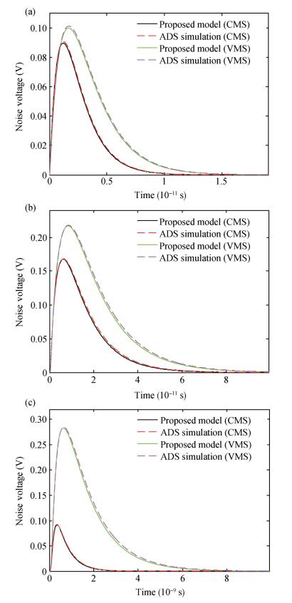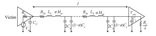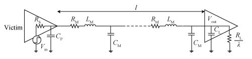 With the continuous advancement of semiconductor technology, the interconnects crosstalk has had a great influence on the performances of VLSI circuits.To date, most of the research about the interconnects of VLSI circuits focus on the voltage-mode signaling (VMS) scheme while the current-mode signaling (CMS) scheme is rarely analyzed.First of all, an equivalent circuit model of two-line coupled interconnects is presented in this paper, which is applicable to both the CMS and VMS schemes.The coupling capacitive and mutual inductive are taken into account in the equivalent circuit model.Secondly, the output noise of CMS and VMS schemes are investigated in the paper according to the decoupling technique andABCD parameter matrix approach at local level, intermediate level and global level, respectively.Moreover, the experimental results show that the CMS interconnects have lesser noise peak, noise width and noise amplitude than the VMS interconnects in the same cases, and the CMS scheme is especially suitable for the global interconnects communication of VLSI circuits.It is found that the results obtained by ABCD parameter matrix approach are in good accordance with the simulation results of the advanced design system.