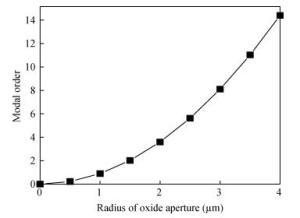 In order to choose the proper radius of oxide aperture for few-mode vertical-cavity surface-emitting lasers (VCSELs), the influences of oxide aperture size on the multi-transverse-mode behaviors are investigated in detail. By establishing the effective refractive index model to simulate VCSELs with different radii of oxide apertures, the wavelength and corresponding order of different modes are obtained. VCSELs with three kinds of oxide apertures are manufactured. Then the multi-transverse-mode spectra and near-field are measured. It is found that when the radius is between 1.5 and 4.5 μm, few-mode VCSELs can be implemented. The 2.5 μm VCSEL manufactured in this paper only emits LP01 mode and LP21 mode. Since the space distance between the two modes is 2 μm, it is expected to realize direct-modulation few-mode VCSELs by channel etching or ion implantation between the two modes.