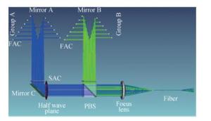 We represent a design of a 20 W, fiber-coupled diode laser module based on 26 single emitters at 520 nm. The module can produce more than 20 W output power from a standard fiber with core diameter of 400 μm and numerical aperture (NA) of 0.22. To achieve a 20 W laser beam, the spatial beam combination and polarization beam combination by polarization beam splitter are used to combine output of 26 single emitters into a single beam, and then an aspheric lens is used to couple the combined beam into an optical fiber. The simulation shows that the total coupling efficiency is more than 95%.
