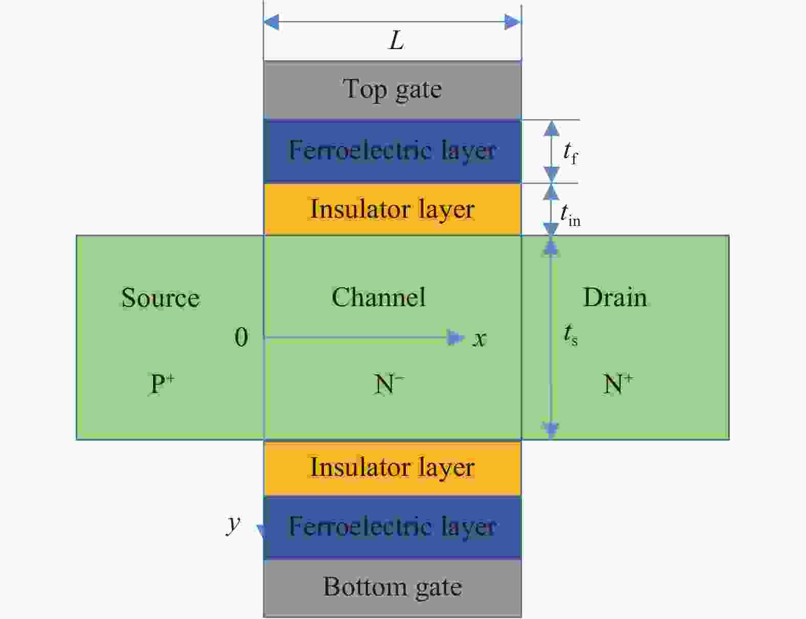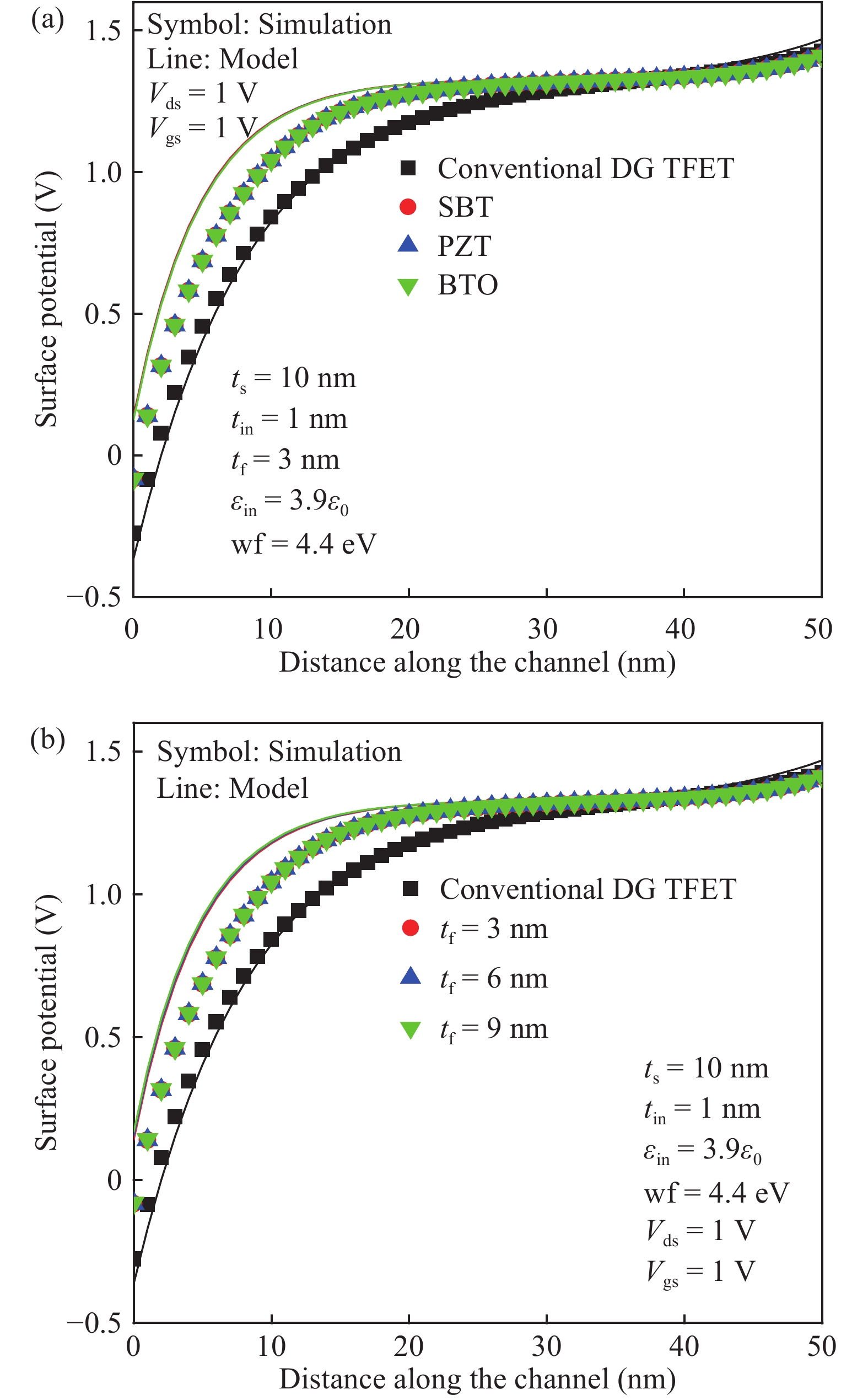 Analytical models are presented for a negative capacitance double-gate tunnel field-effect transistor (NC DG TFET) with a ferroelectric gate dielectric in this paper. The model accurately calculates the channel potential profile by solving the Poisson equation with the Landau–Khalatnikov (LK) equation. Moreover, the effects of the channel mobile charges on the potential are also taken into account. We also analyze the dependences of the channel potential and the on-state current on the device parameters by changing the thickness of ferroelectric layer, ferroelectric material and also verify the simulation results accord with commercial TCAD. The results show that the device can obtain better characteristics when the thickness of the ferroelectric layer is larger as it can reduce the shortest tunneling length.