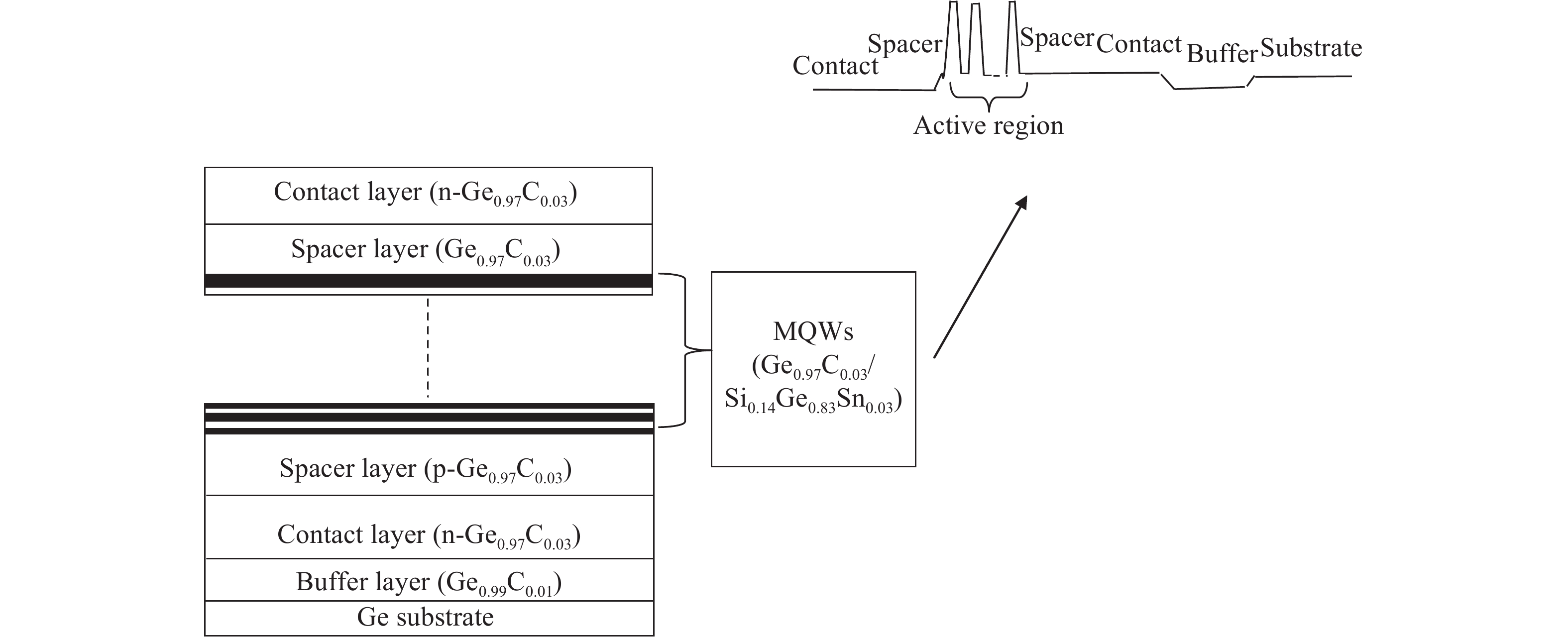 The double barrier quantum well (DBQW) resonant tunneling diode (RTD) structure made of SiGeSn/GeC/SiGeSn alloys grown on Ge substrate is analyzed. The tensile strained Ge1?zCz on Si1?x?yGexSny heterostructure provides a direct band gap type I configuration. The transmission coefficient and tunneling current density have been calculated considering single and multiple quantum wells. A comparative study of tunnelling current of the proposed structure is done with the existing RTD structure based on GeSn/SiGeSn DBH. A higher value of the current density for the proposed structure has been obtained.