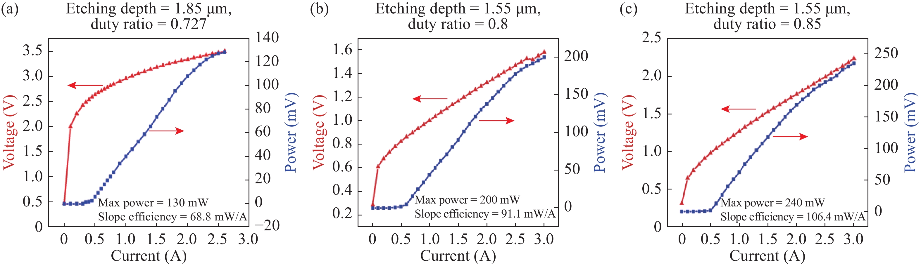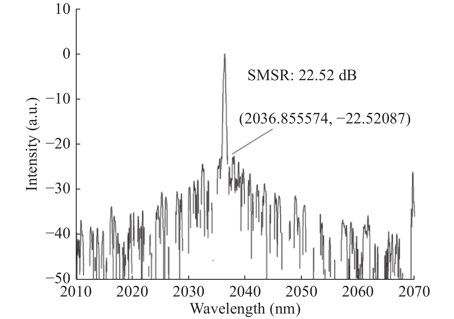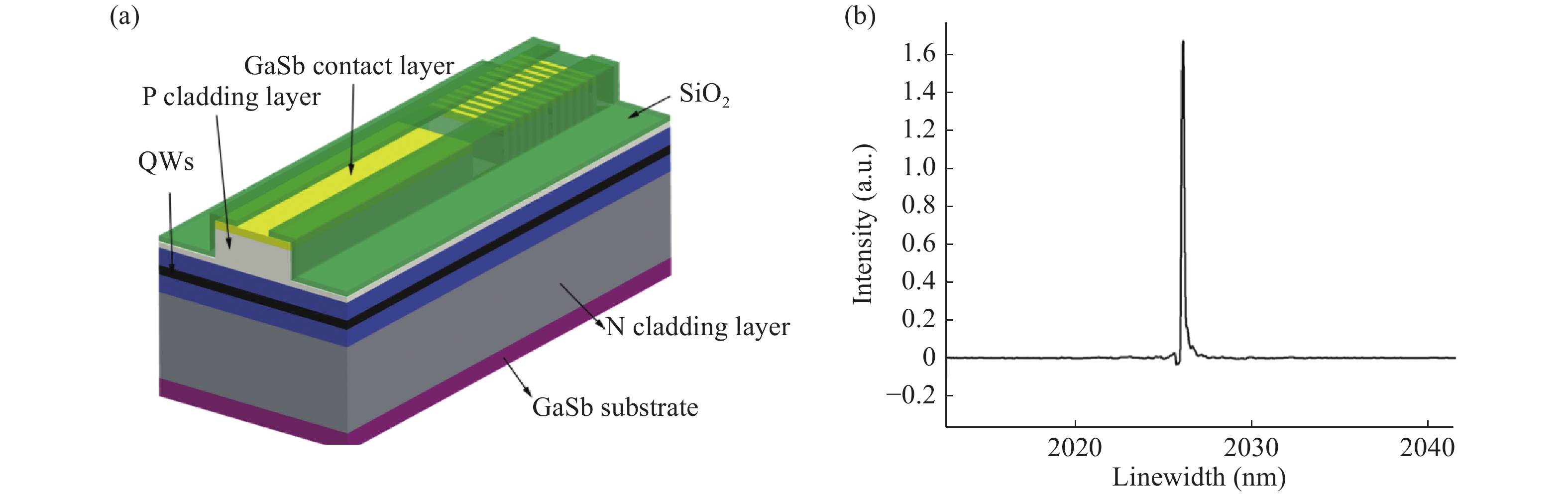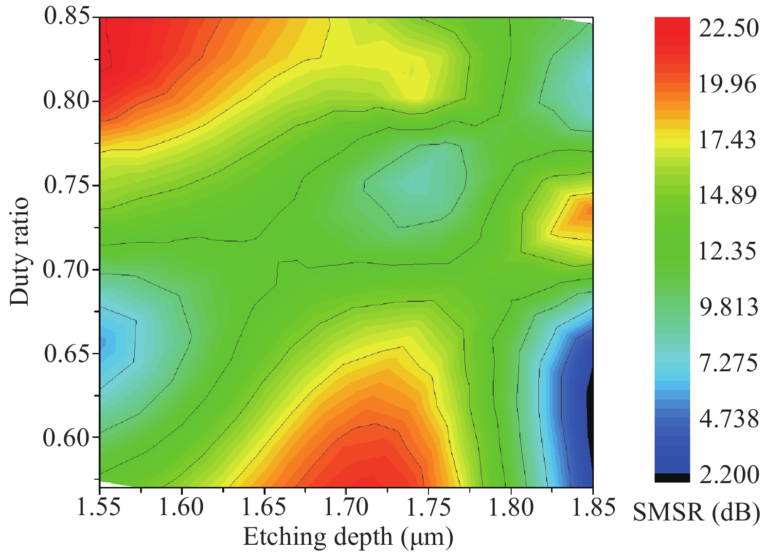 The GaSb-based distributed Bragg reflection (DBR) diode laser with 23rd-order gratings have been fabricated by conventional UV lithography and inductively coupled plasma (ICP) etching. The ICP etching conditions were optimized and the relationship among etching depth, duty ratio and side-mode suppression ratio (SMSR) was studied. The device with a ridge width of 100 μm, gratings period of 13 μm and etching depth of 1.55 μm as well as the duty ratio of 85% was fabricated, its maximum SMSR reached 22.52 dB with uncoated cavity facets under single longitudinal operation mode at room temperature.