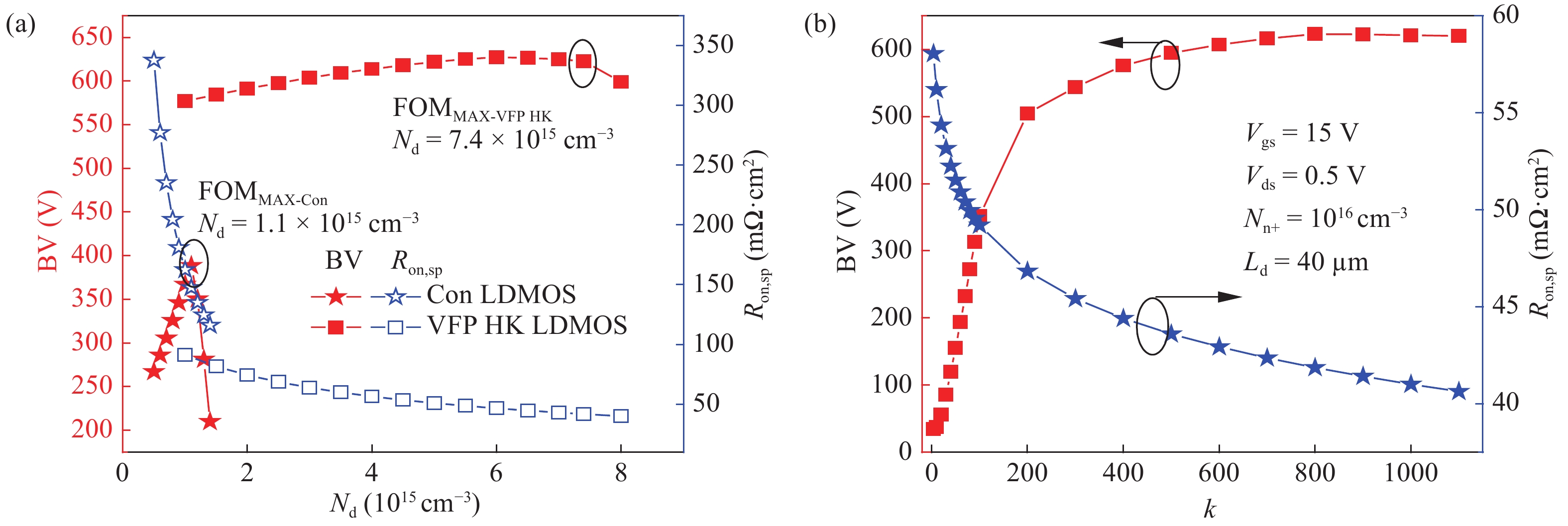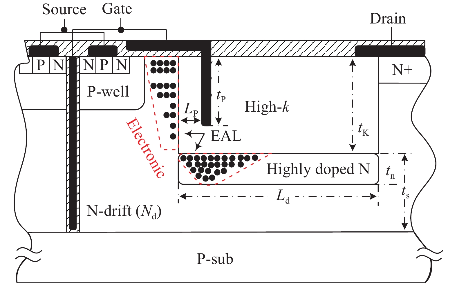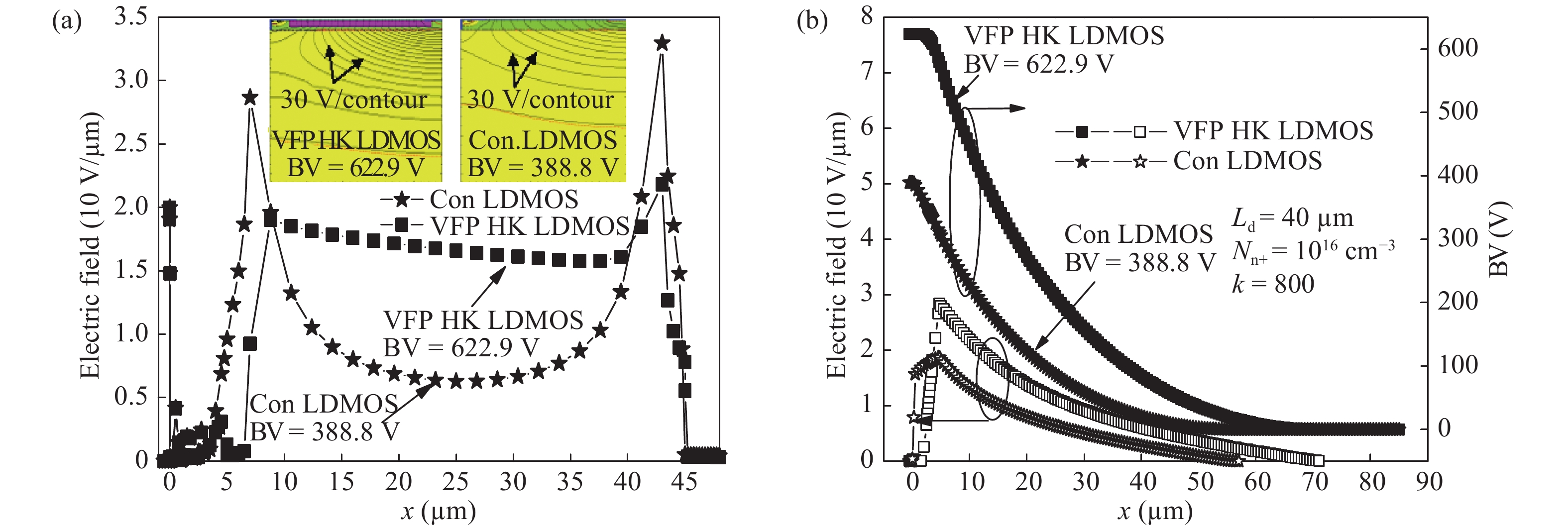 An ultralow specific on-resistance high-k LDMOS with vertical field plate (VFP HK LDMOS) is proposed. The high-k dielectric trench and highly doped interface N+ layer are made in bulk silicon to reduce the surface field of the drift region in the VFP HK LDMOS. The gate vertical field plate (VFP) pinning in the high-k dielectric trench can modulate the bulk electric field. The high-k dielectric not only provides polarized charges to assist depletion of the drift region, so that the drift region and high-k trench maintain charge balance adaptively, but also can fully assist in depleting the drift region to increase the drift doping concentration and reshape the electric field to avoid premature breakdown. Compared with the conventional structure, the VFP HK LDMOS has the breakdown voltage of 629.1 V at the drift length of 40 μm and the specific on-resistance of 38.4 mΩ·cm2 at the gate potential of 15 V. Then the power figure of merit is 10.31 MW/cm2.