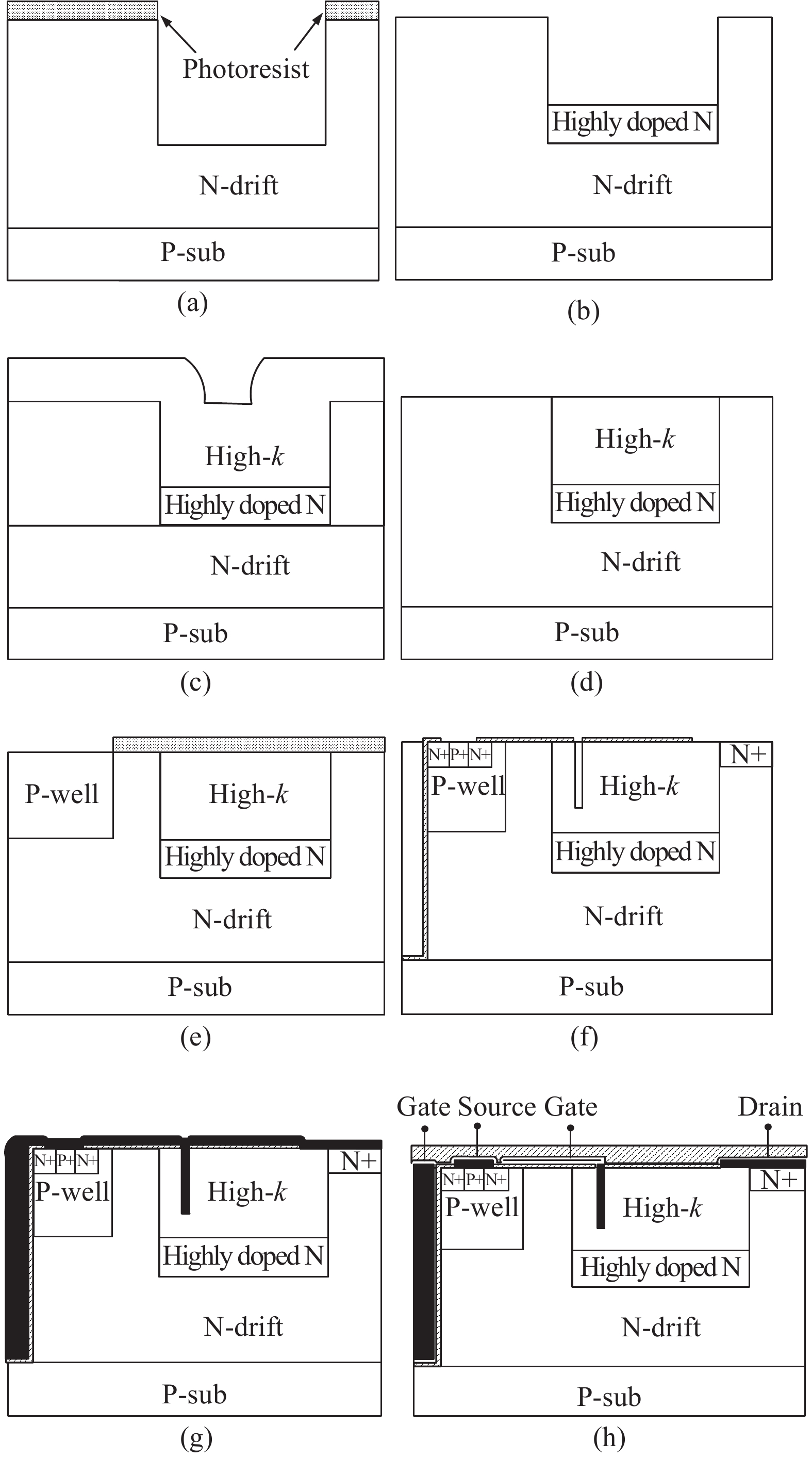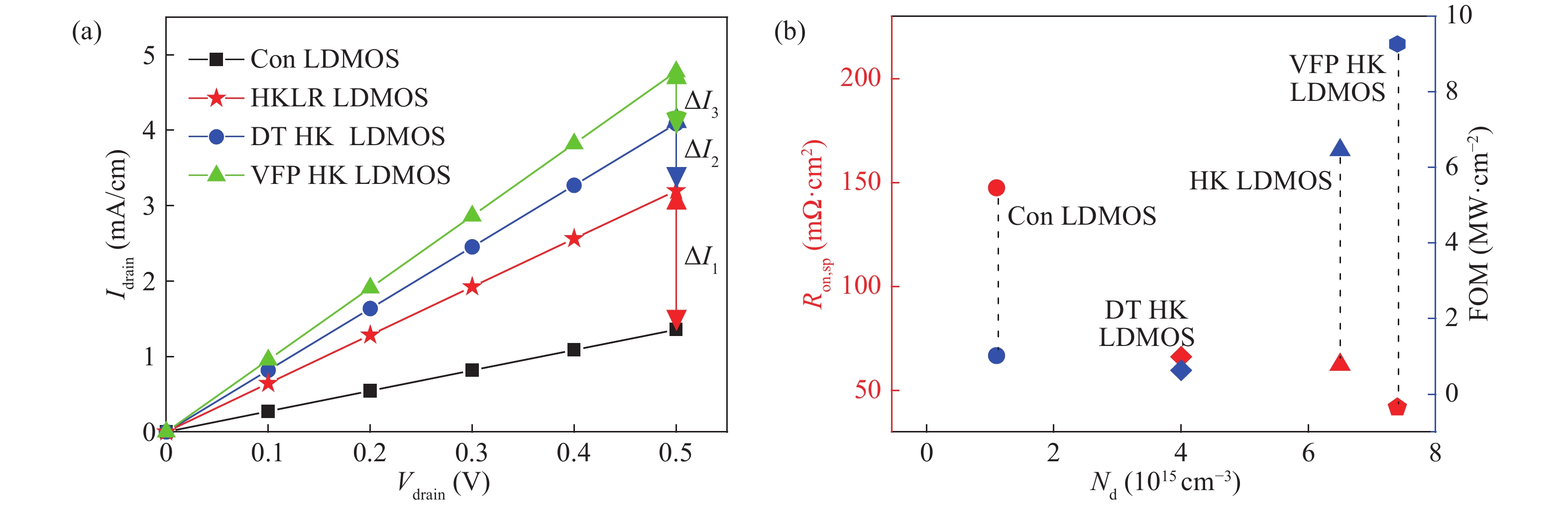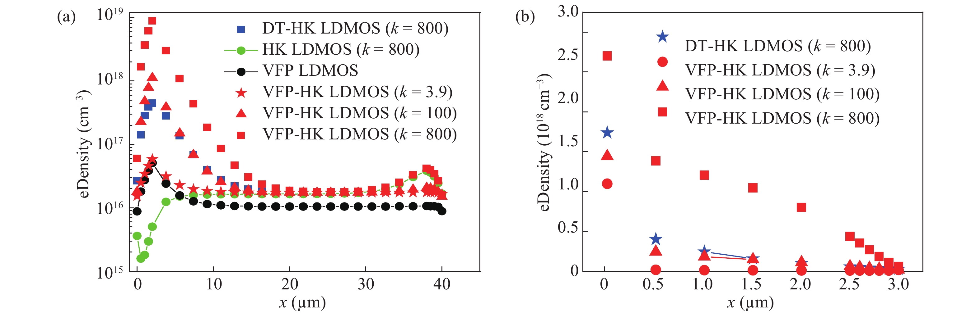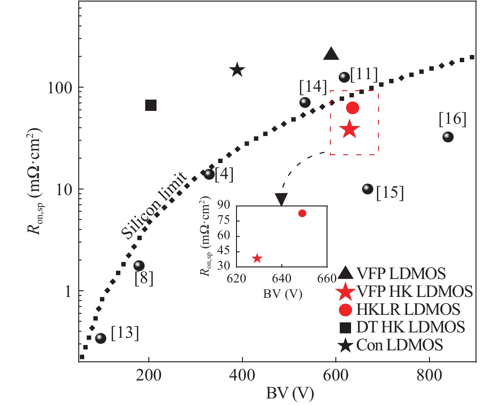 An ultralow specific on-resistance high-k LDMOS with vertical field plate (VFP HK LDMOS) is proposed. The high-k dielectric trench and highly doped interface N+ layer are made in bulk silicon to reduce the surface field of the drift region in the VFP HK LDMOS. The gate vertical field plate (VFP) pinning in the high-k dielectric trench can modulate the bulk electric field. The high-k dielectric not only provides polarized charges to assist depletion of the drift region, so that the drift region and high-k trench maintain charge balance adaptively, but also can fully assist in depleting the drift region to increase the drift doping concentration and reshape the electric field to avoid premature breakdown. Compared with the conventional structure, the VFP HK LDMOS has the breakdown voltage of 629.1 V at the drift length of 40 μm and the specific on-resistance of 38.4 mΩ·cm2 at the gate potential of 15 V. Then the power figure of merit is 10.31 MW/cm2.
