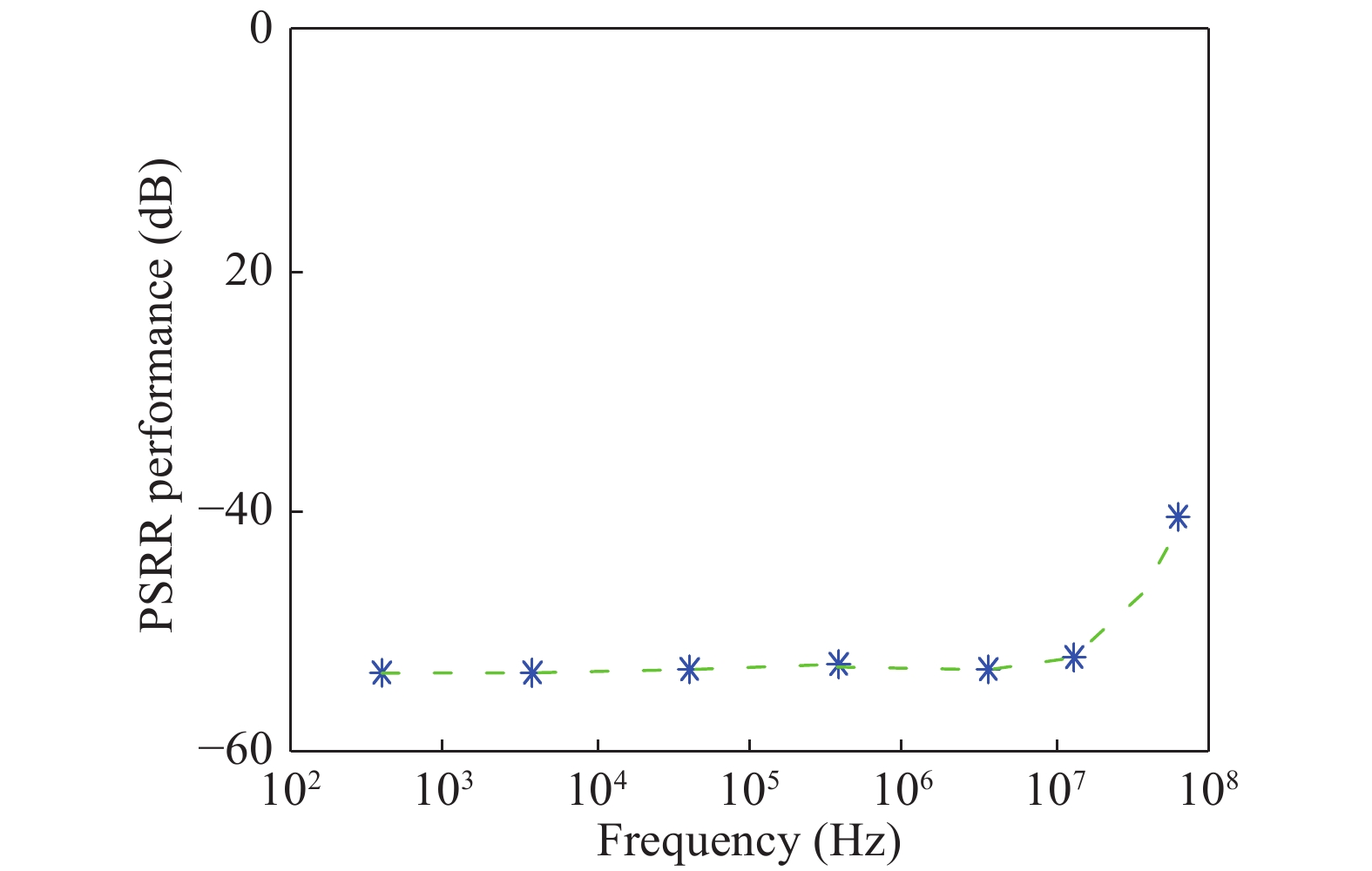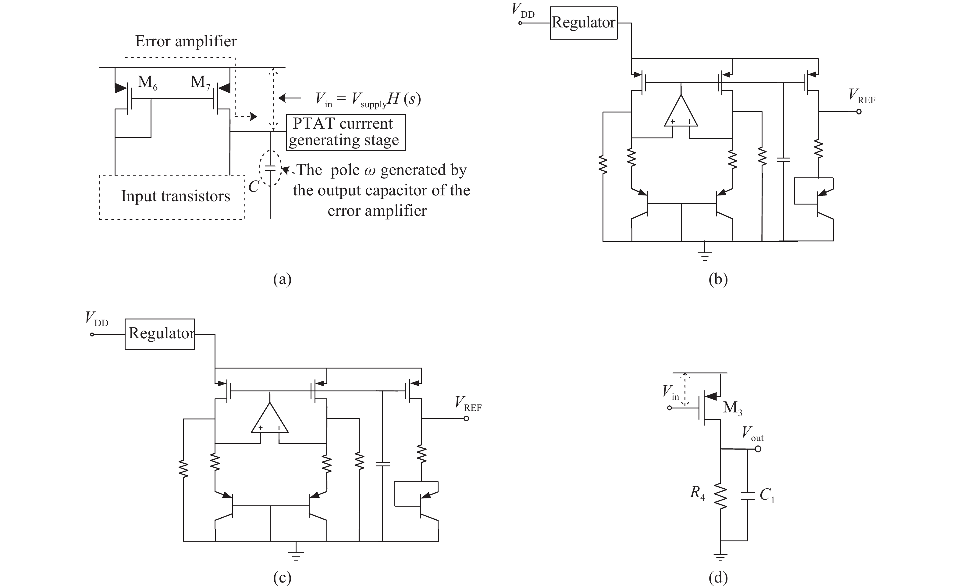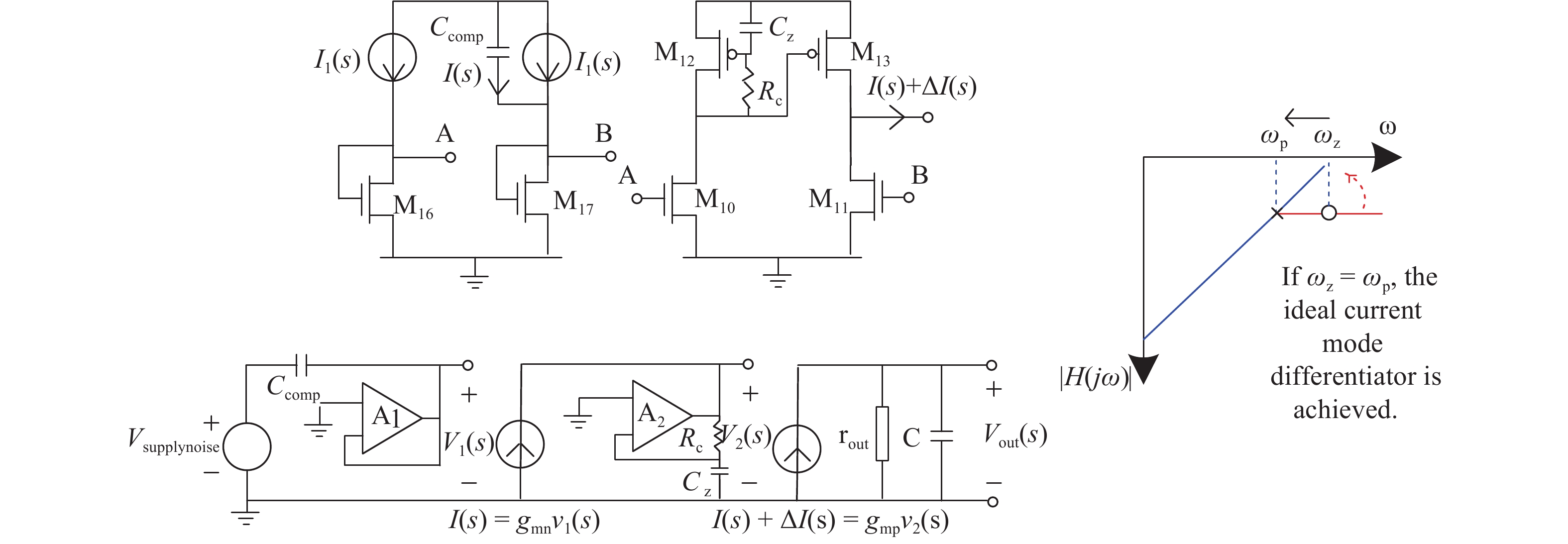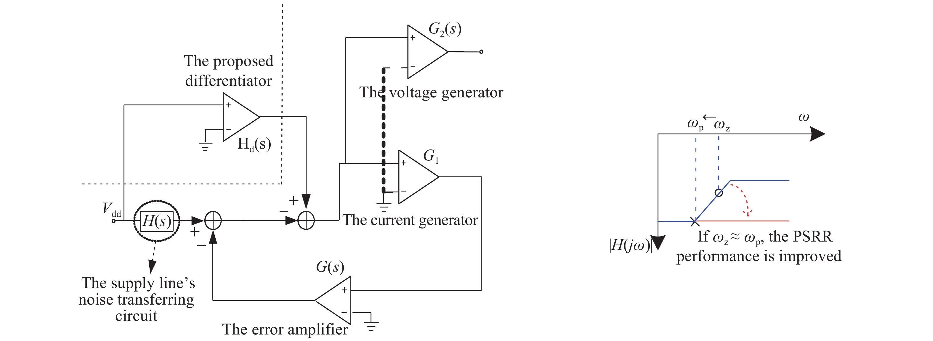 We present a voltage reference using a wide-band cascaded current mode differentiator, for the improved PSRR performance. Compared with the conventional references, the reference with the technique is mainly characterized by a two cascaded stages current mode signal differentiator. In the differentiator, a zero OTA Gm is proposed, to achieve the wide-band differential characteristic. With the technique, the PSRR beyond the pole’s corresponding frequency can be significantly improved with the minimum supply voltage only about VGS_PMOS + (VGS_NMOS ? VTH). Fabricated with a 0.18 μm CMOS process, with the 0.9 V supply voltage, the PSRR @ 20 MHz of the reference is achieved at ?54 dB. Moreover, the power dissipation is 19 μW.