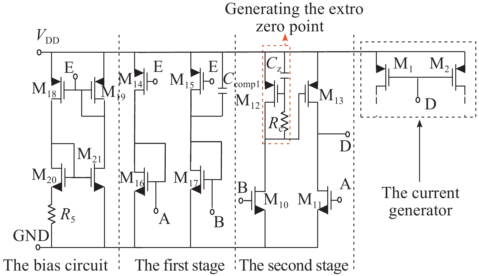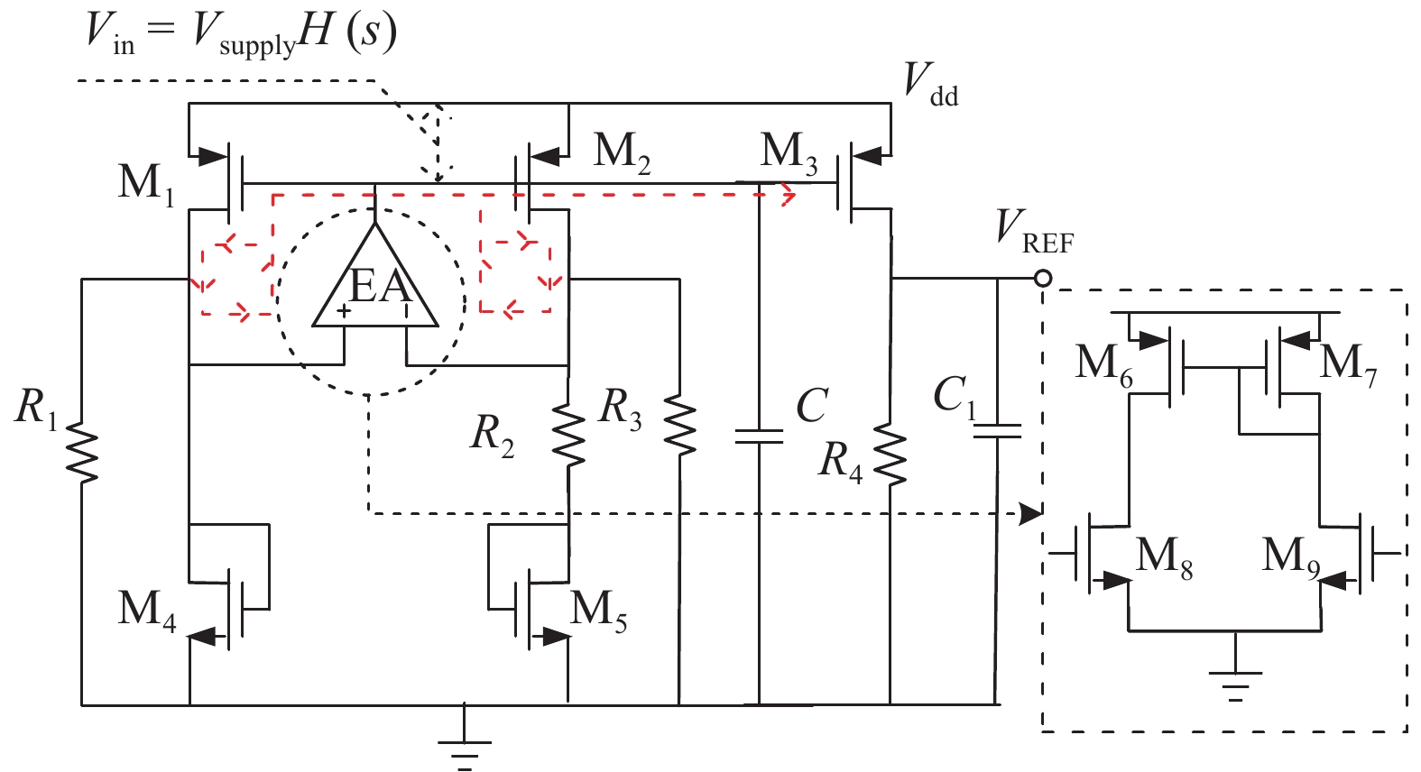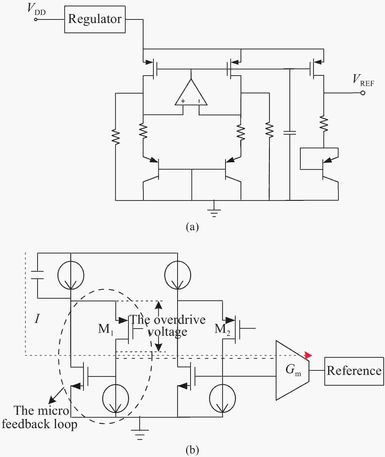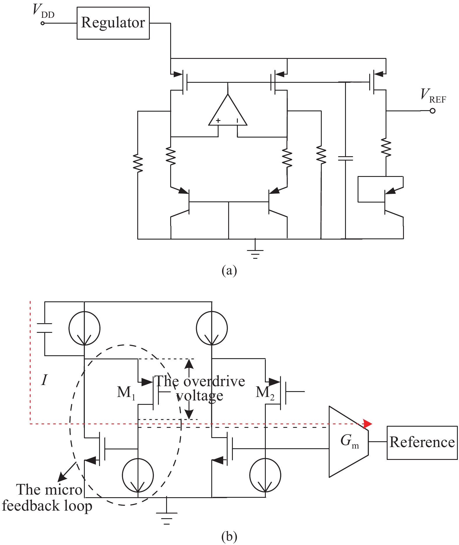 We present a voltage reference using a wide-band cascaded current mode differentiator, for the improved PSRR performance. Compared with the conventional references, the reference with the technique is mainly characterized by a two cascaded stages current mode signal differentiator. In the differentiator, a zero OTA Gm is proposed, to achieve the wide-band differential characteristic. With the technique, the PSRR beyond the pole’s corresponding frequency can be significantly improved with the minimum supply voltage only about VGS_PMOS + (VGS_NMOS ? VTH). Fabricated with a 0.18 μm CMOS process, with the 0.9 V supply voltage, the PSRR @ 20 MHz of the reference is achieved at ?54 dB. Moreover, the power dissipation is 19 μW.