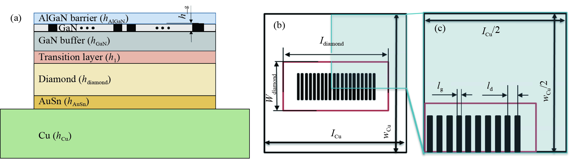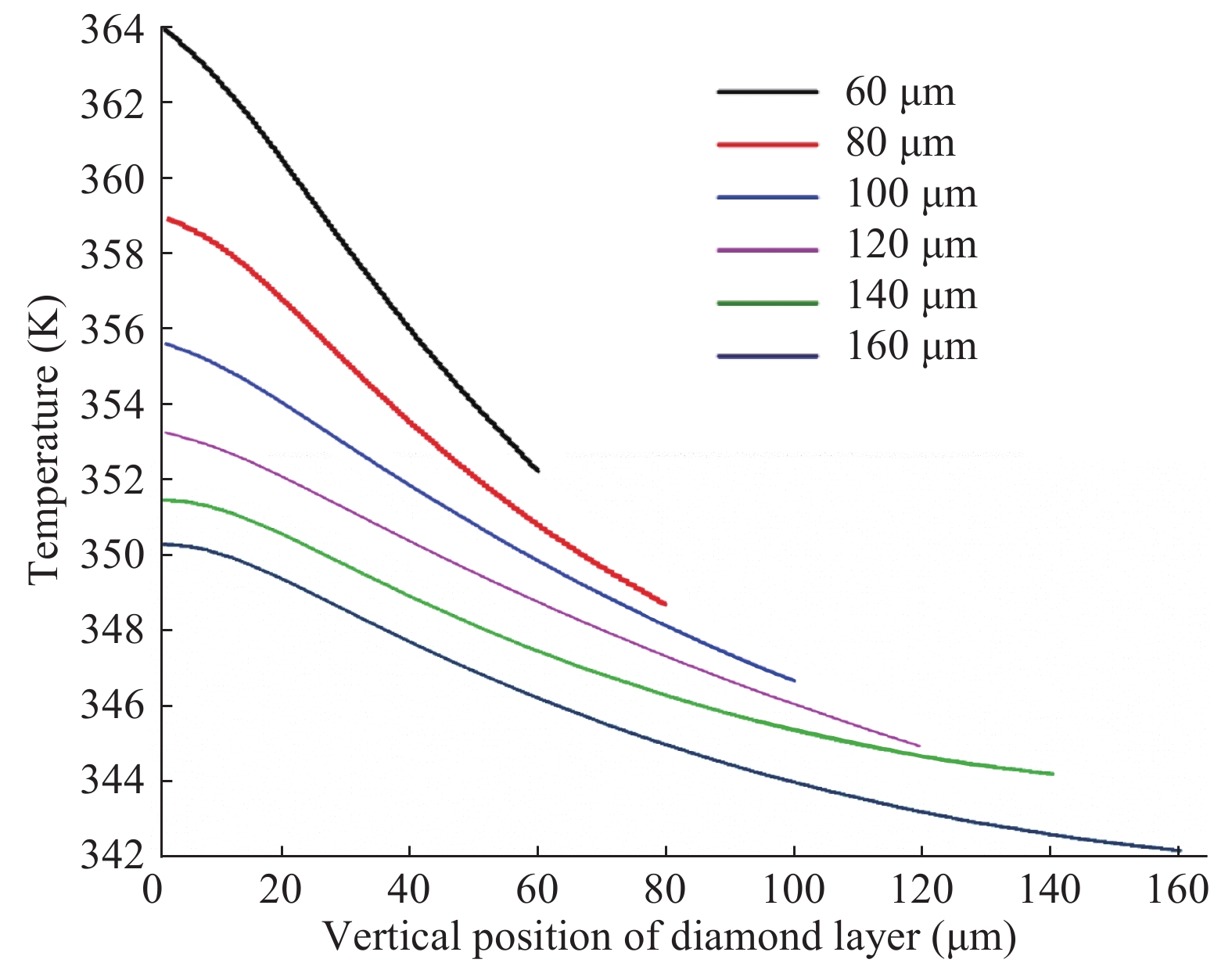 A three-dimensional thermal analysis of GaN HEMTs on diamond substrate is investigated using the finite element method. The diamond substrate thickness, area and shape, transition layer thickness and thermal conductivity of the transition layer are considered and treated appropriately in the numerical simulation. The temperature distribution and heat spreading paths are investigated under different conditions and the results indicate that the existence of the transition layer causes an increase in the channel temperature and the thickness, area and shape of the diamond substrate have certain impacts on the channel temperature too. Channel temperature reduces with increasing diamond substrate thickness and area but with a decreasing trend, which can be explained by the saturation effects of the diamond substrate. The shape of diamond substrate also affects the temperature performance of GaN HEMTs, therefore, to achieve a favorable heat dissipation effect with the settled diamond substrate area, the shape should contain as many isothermal curves as possible when the isothermal gradient is constant. The study of the thermal properties of GaN on diamond substrate is useful for the prediction of heating of high power GaN HEMTs devices and optimal designs of an efficient heat spreader for GaN HEMTs.