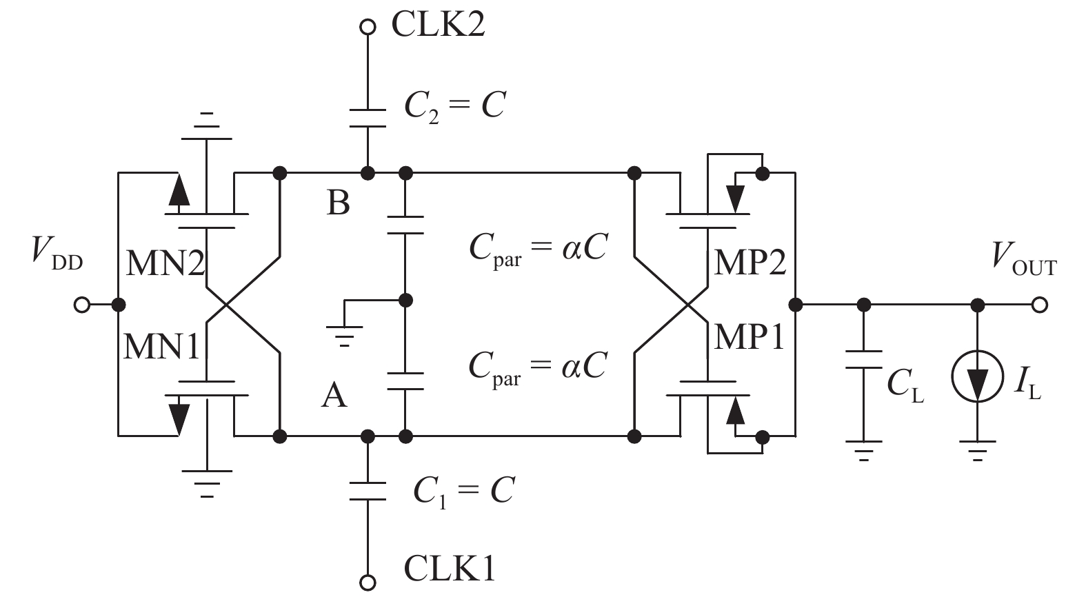 This paper presents a high-efficiency charge pump circuit composed of cascaded cross-coupled voltage doublers implemented in an isolated bipolar-CMOS-DMOS (BCD) technology for implantable medical devices. Taking advantage of the transistor structures in the isolated BCD process, the leakage currents caused by the parasitic PNP transistors in the cross-coupled PMOS serial switches are eliminated by simply connecting the inside substrate terminal to the isolation terminal of each PMOS transistor. The simple circuit structure leads to small parasitic capacitance in the voltage doubler, which in turn ensures high efficiency of the overall charge pump. The proposed charge pump with 5 cascaded voltage doublers is fabricated in a 0.35-μm isolated BCD process. Measurement results with 2-V power supply, 1-MHz driving clock frequency and 40-μA current load show that an efficiency of 72.6% is achieved, and the output voltage can be pumped to about 11.5 V at zero load current. The chip area of the charge pump is 1.6 × 0.35 mm2.
