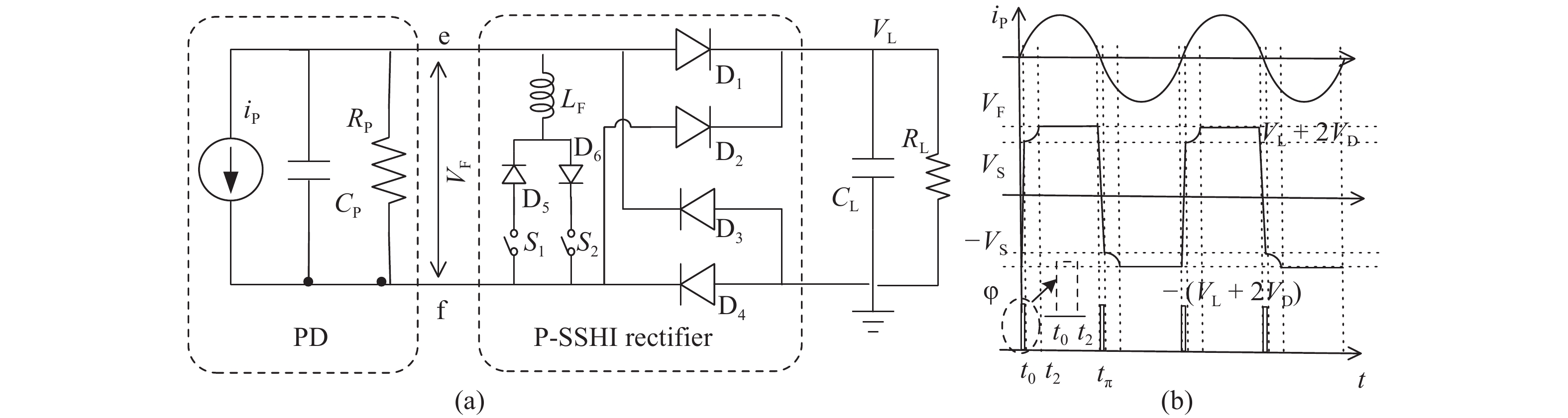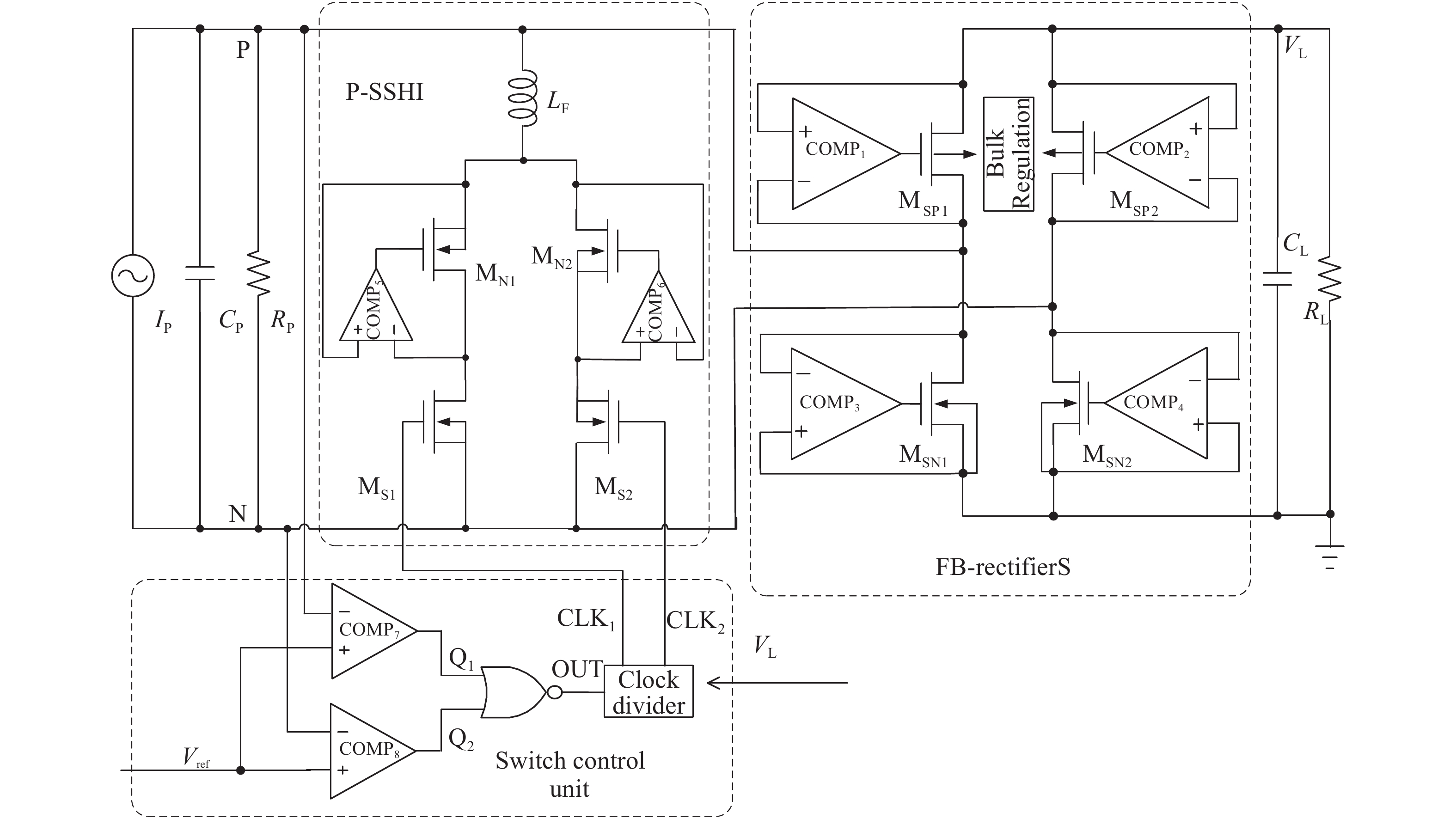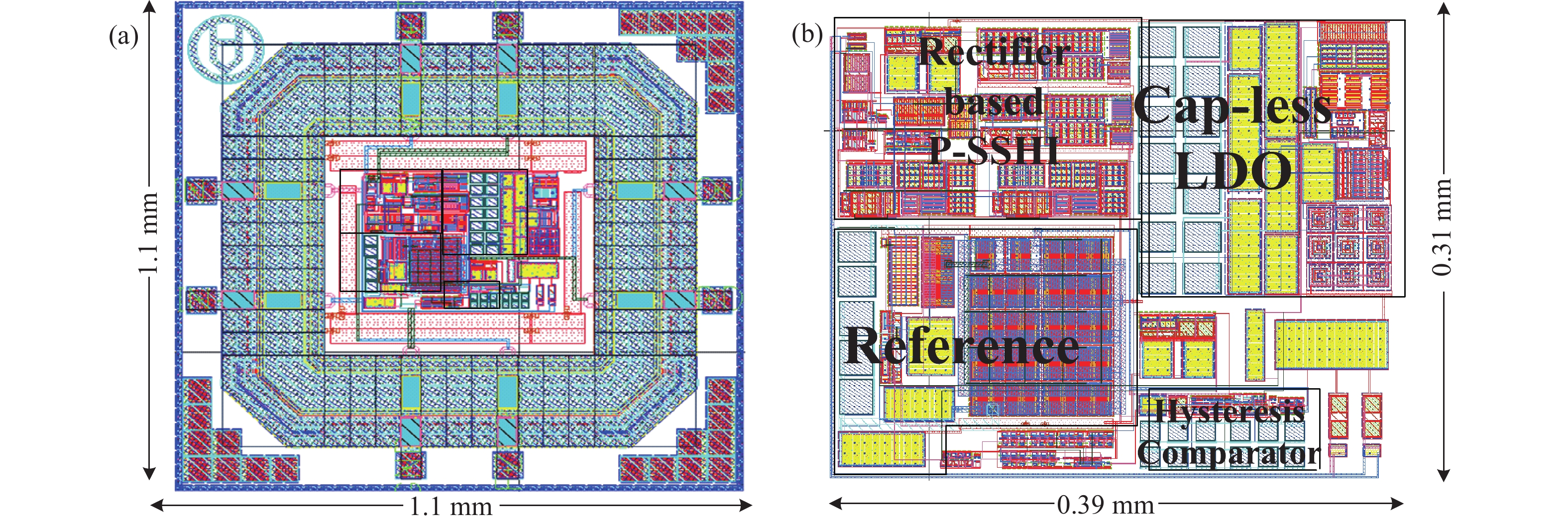 The key to self-powered technique is initiative to harvest energy from the surrounding environment. Harvesting energy from an ambient vibration source utilizing piezoelectrics emerged as a popular method. Efficient interface circuits become the main limitations of existing energy harvesting techniques. In this paper, an interface circuit for piezoelectric energy harvesting is presented. An active full bridge rectifier is adopted to improve the power efficiency by reducing the conduction loss on the rectifying path. A parallel synchronized switch harvesting on inductor (P-SSHI) technique is used to improve the power extraction capability from piezoelectric harvester, thereby trying to reach the theoretical maximum output power. An intermittent power management unit (IPMU) and an output capacitor-less low drop regulator (LDO) are also introduced. Active diodes (AD) instead of traditional passive ones are used to reduce the voltage loss over the rectifier, which results in a good power efficiency. The IPMU with hysteresis comparator ensures the interface circuit has a large transient output power by limiting the output voltage ranges from 2.2 to 2 V. The design is fabricated in a SMIC 0.18 μm CMOS technology. Simulation results show that the flipping efficiency of the P-SSHI circuit is over 80% with an off-chip inductor value of 820 μH. The output power the proposed rectifier can obtain is 44.4 μW, which is 6.7× improvement compared to the maximum output power of a traditional rectifier. Both the active diodes and the P-SSHI help to improve the output power of the proposed rectifier. LDO outputs a voltage of 1.8 V with the maximum 90% power efficiency. The proposed P-SSHI rectifier interface circuit can be self-powered without the need for additional power supply.