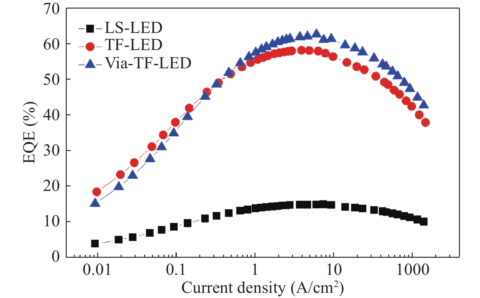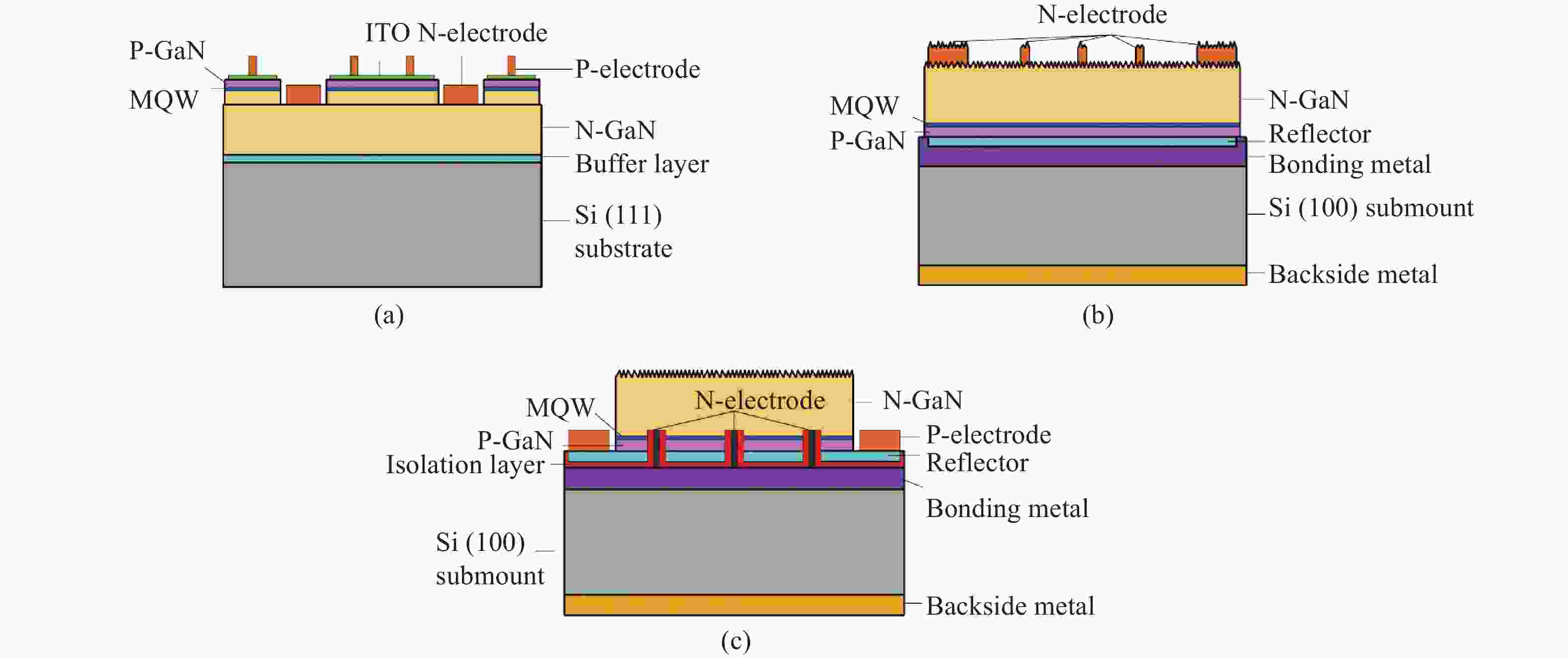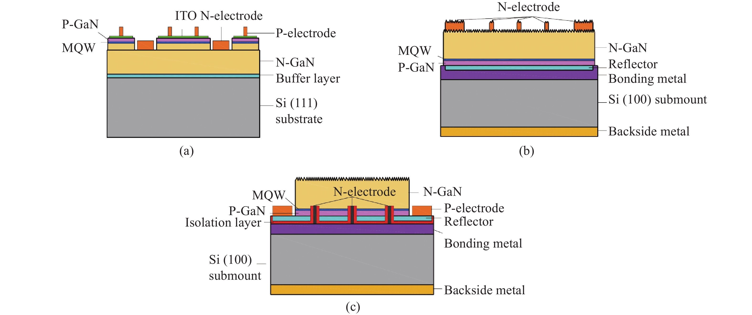 This work reports the fabrication of via-thin-film light-emitting diode (via-TF-LED) to improve the light output power (LOP) of blue/white GaN-based LEDs grown on Si (111) substrates. The as-fabricated via-TF-LEDs were featured with a roughened n-GaN surface and the p-GaN surface bonded to a wafer carrier with a silver-based reflective electrode, together with an array of embedded n-type via pillar metal contact from the p-GaN surface etched through the multiple-quantum-wells (MQWs) into the n-GaN layer. When operated at 350 mA, the via-TF-LED gave an enhanced blue LOP by 7.8% and over 3.5 times as compared to the vertical thin-film LED (TF-LED) and the conventional lateral structure LED (LS-LED). After covering with yellow phosphor that converts some blue photons into yellow light, the via-TF-LED emitted an enhanced white luminous flux by 13.5% and over 5 times, as compared with the white TF-LED and the white LS-LED, respectively. The significant LOP improvement of the via-TF-LED was attributed to the elimination of light absorption by the Si (111) epitaxial substrate and the finger-like n-electrodes on the roughened emitting surface.