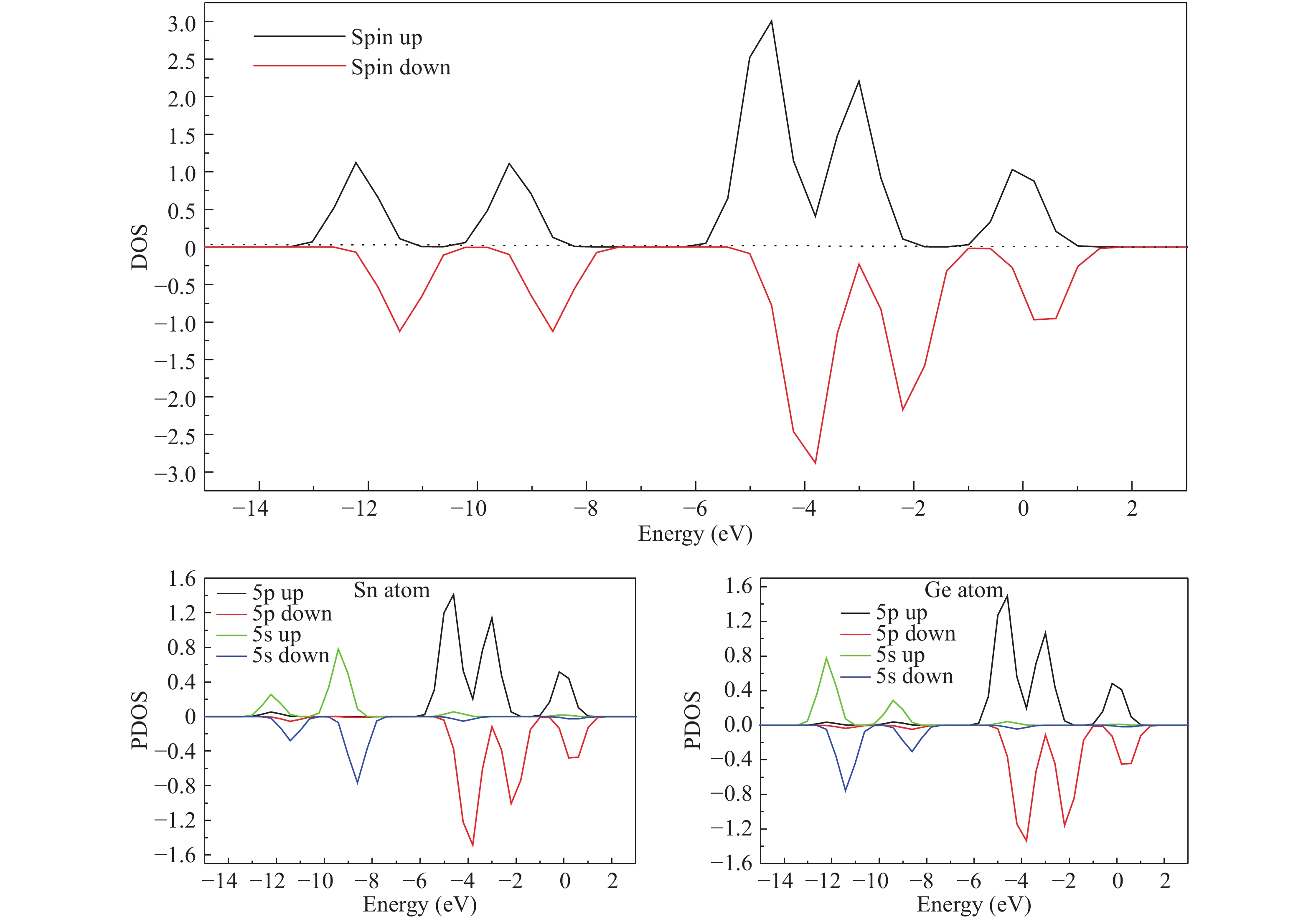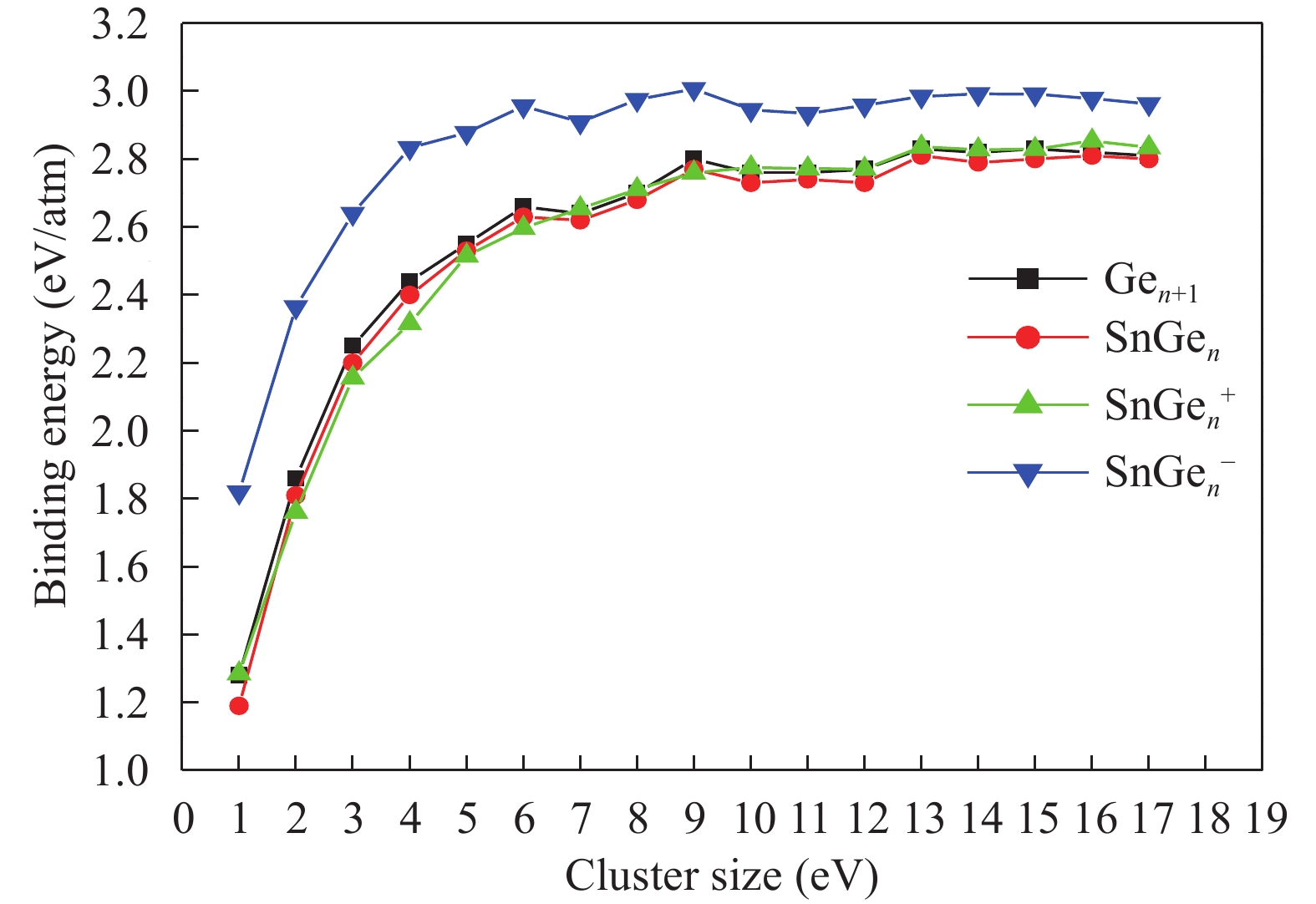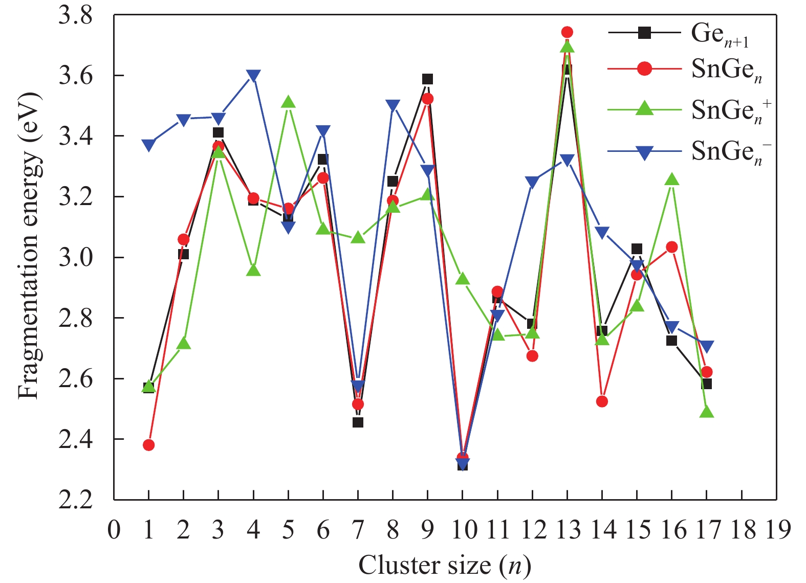 The structures, relative stability and magnetic properties of pure Gen+1, neutral cationic and anionic SnGen (n = 1–17) clusters have been investigated by using the first principles density functional theory implemented in SIESTA packages. We find that with the increasing of cluster size, the Gen+1 and SnGen(0, ±1) clusters tend to adopt compact structures. It has been also found that the Sn atom occupied a peripheral position for SnGen clusters when n < 12 and occupied a core position for n > 12. The structural and electronic properties such as optimized geometries, fragmentation energy, binding energy per atom, HOMO–LUMO gaps and second-order differences in energy of the pure Ge n+1 and SnGen clusters in their ground state are calculated and analyzed. All isomers of neutral SnGen clusters are generally nonmagnetic except for n = 1 and 4, where the total spin magnetic moments is 2μb. The total (DOS) and partial density of states of these clusters have been calculated to understand the origin of peculiar magnetic properties. The cluster size dependence of vertical ionization potentials, vertical electronic affinities, chemical hardness, adiabatic electron affinities and adiabatic ionization potentials have been calculated and discussed.