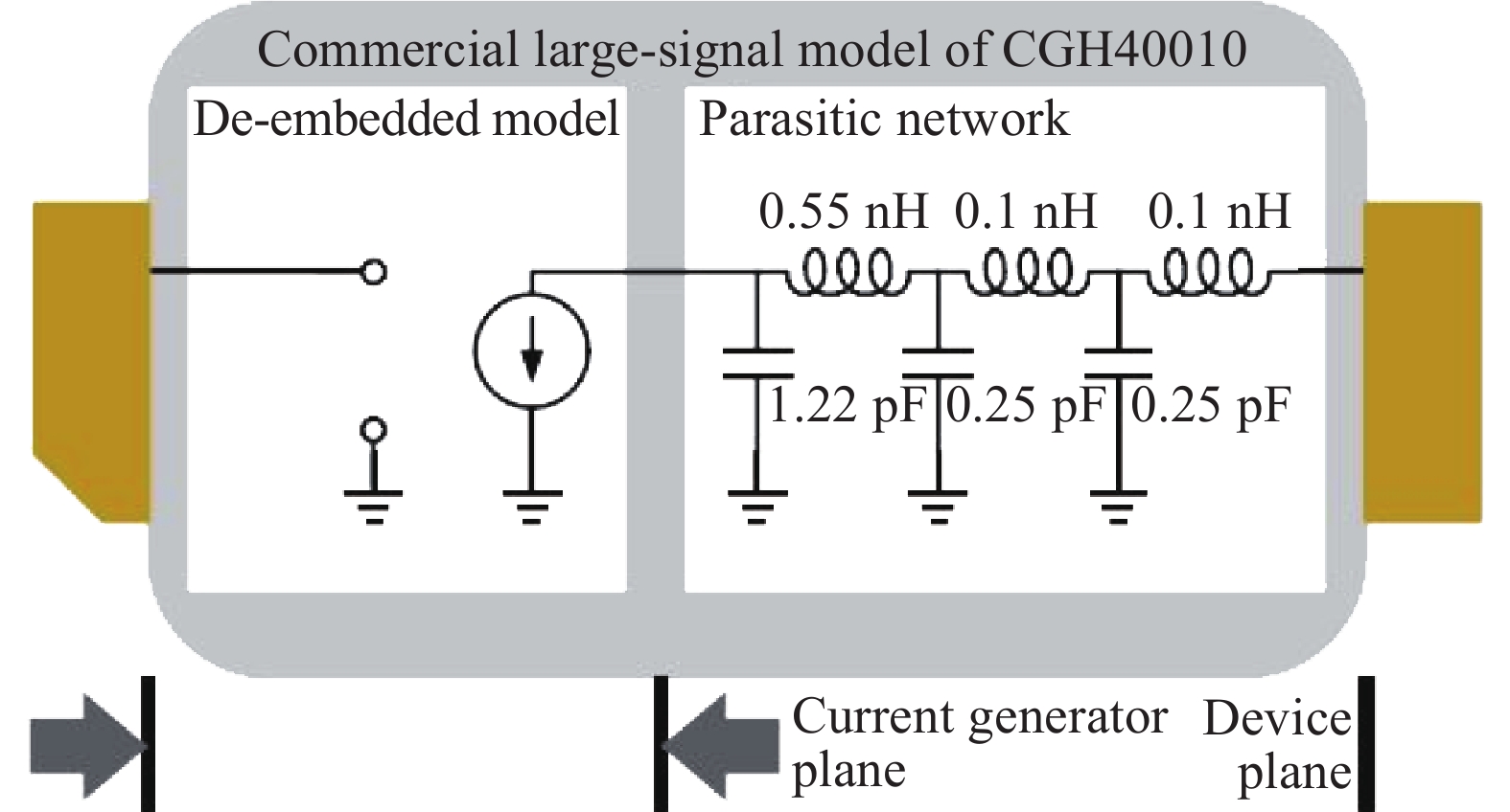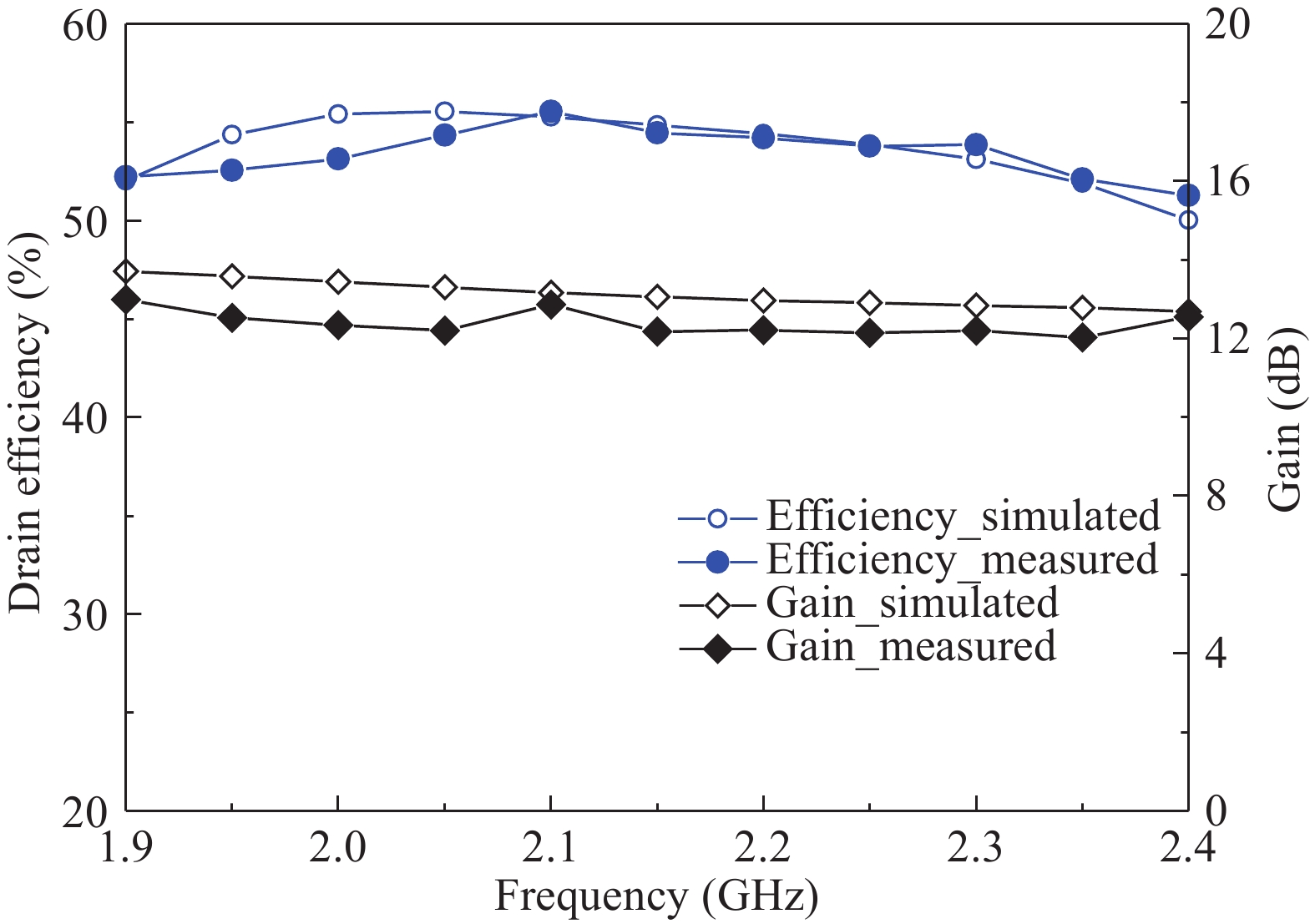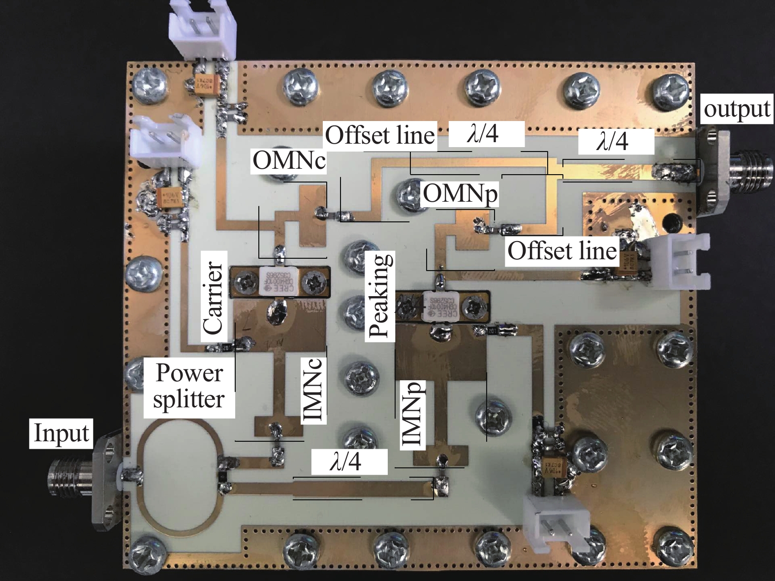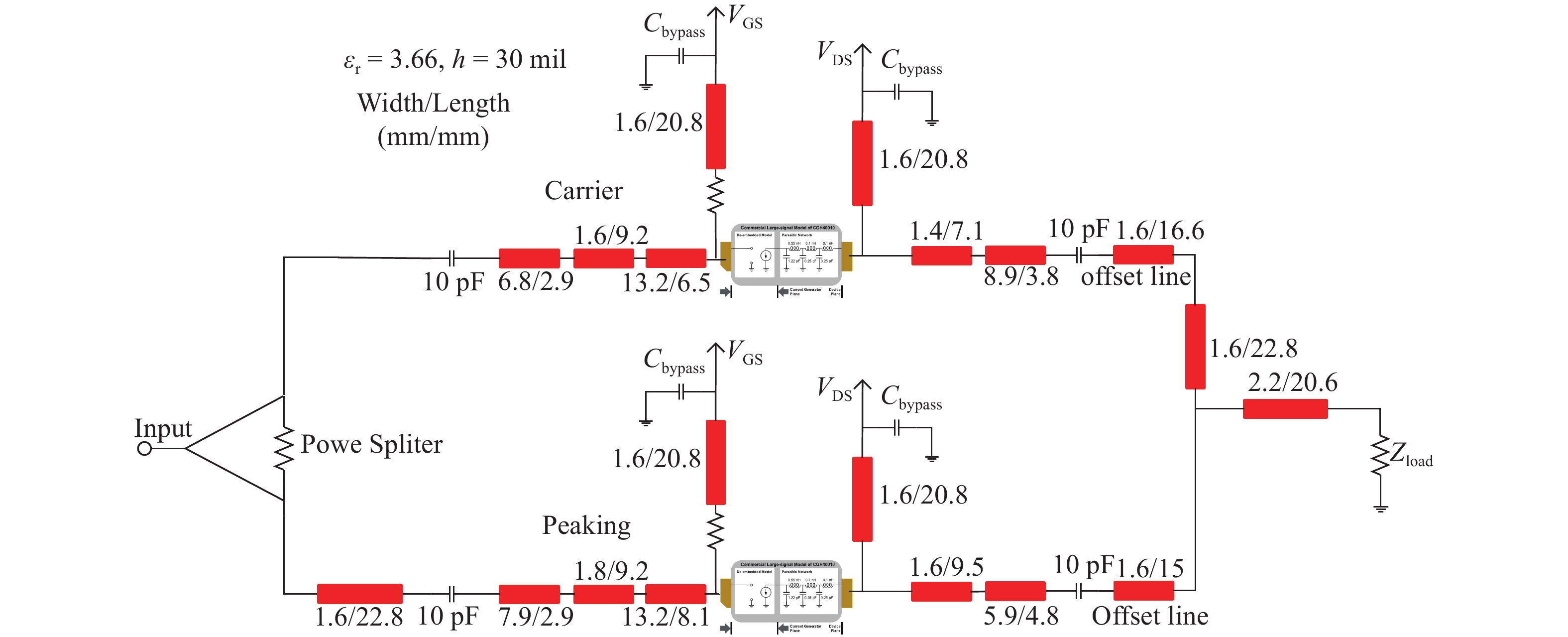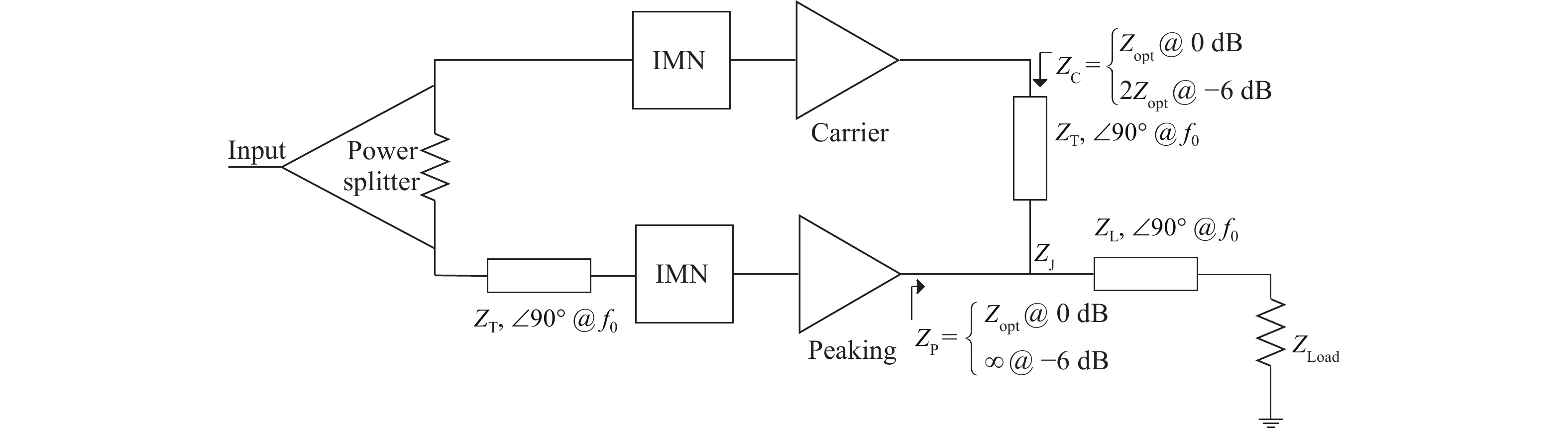This paper proposes a method for broadband and high-efficiency amplification of Doherty power amplifier (DPA) using symmetric devices. In order to achieve the perfect load modulation, the carrier amplifier output circuit total power length is designed to odd multiple of 90°, and the peak amplifier output total power length is designed to even multiple of 180°. The proposed method is demonstrated by designing a broadband high-efficiency DPA using identical 10-W packaged GaN HEMT devices. Measurement results show that over 51% drain efficiency is achieved at 6-dB back-off power, over the frequency band of 1.9–2.4 GHz.