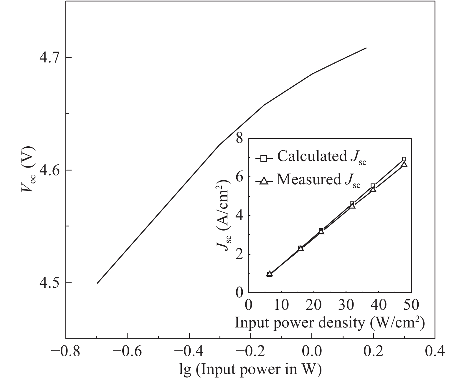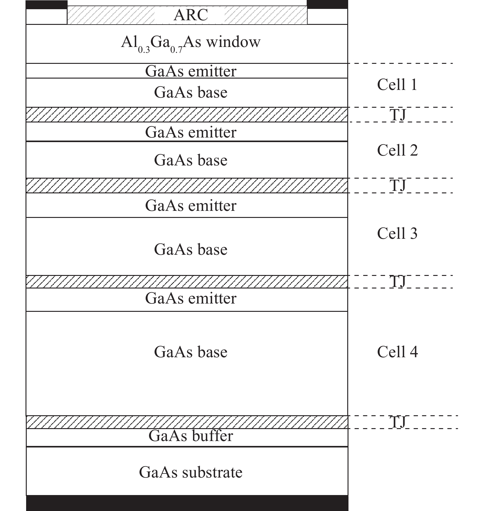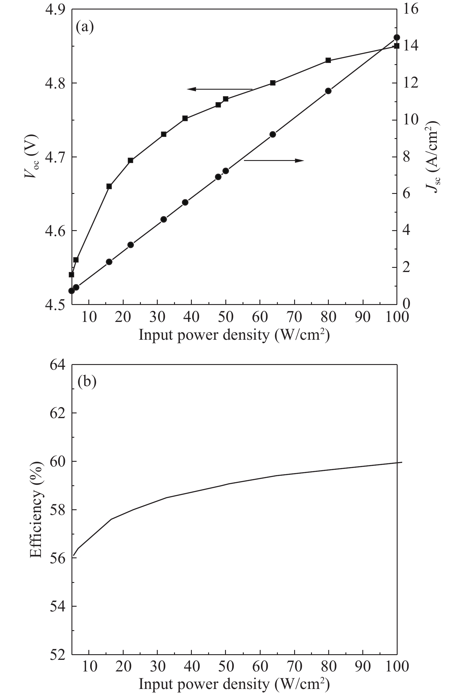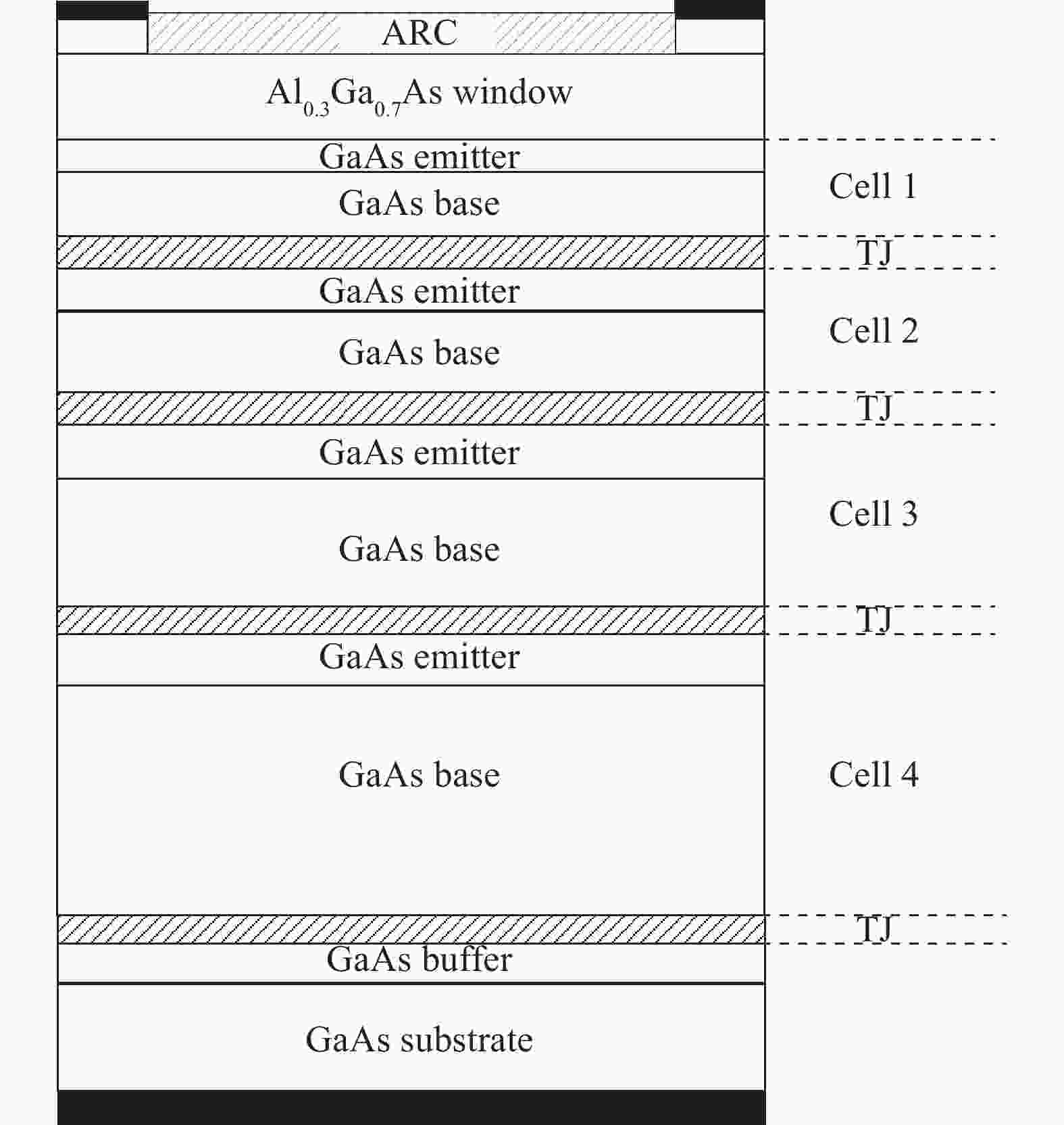 Four-junction AlGaAs/GaAs laser power converters (LPCs) with n+-GaAs/p+-Al0.37Ga0.63As heterostructure tunnel junctions (TJs) have been designed and grown by metal-organic chemical vapor deposition (MOCVD) for converting the power of 808 nm lasers. A maximum conversion efficiency ηc of 56.9% ± 4% is obtained for cells with an aperture of 3.14 mm2 at an input laser power of 0.2 W, while dropping to 43.3% at 1.5 W. Measured current–voltage (I–V) characteristics indicate that the performance of the LPC can be further improved by increasing the tunneling current density of TJs and optimizing the thicknesses of sub-cells to achieve current matching in LPC.