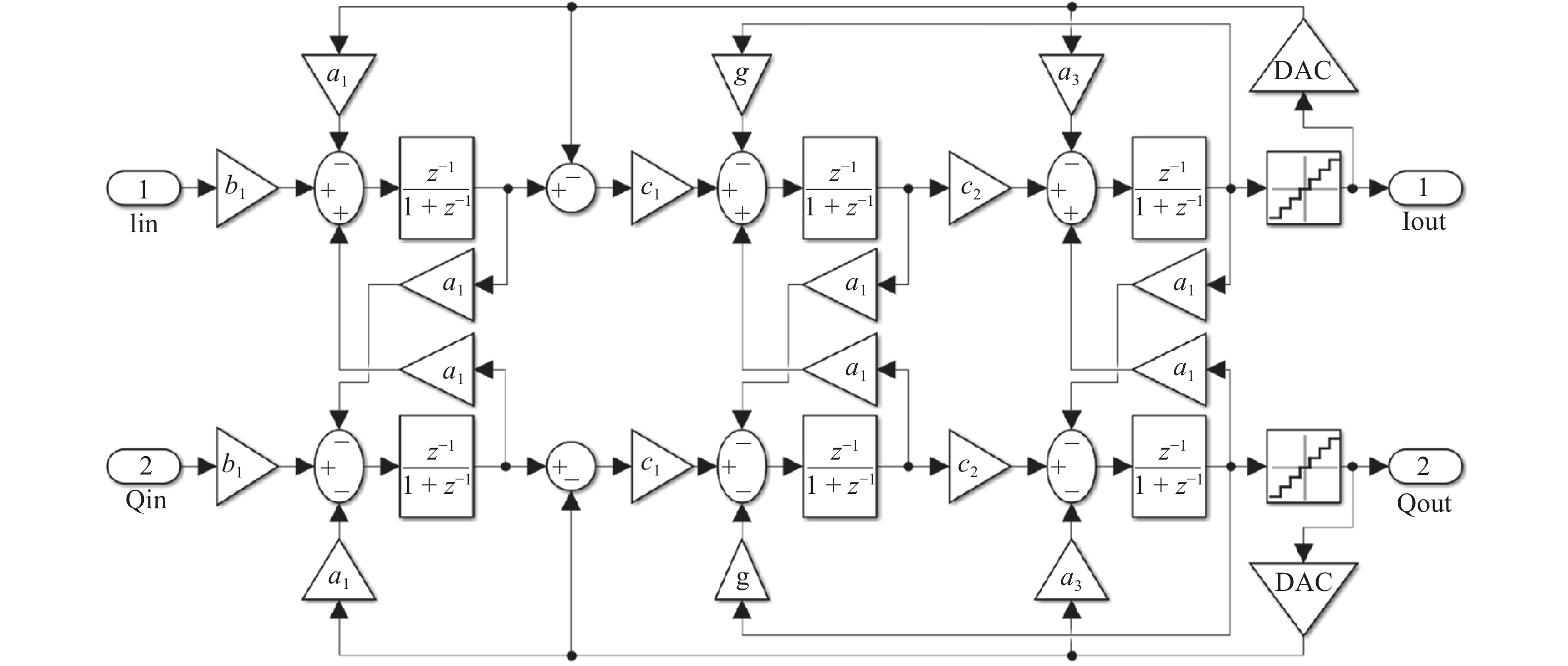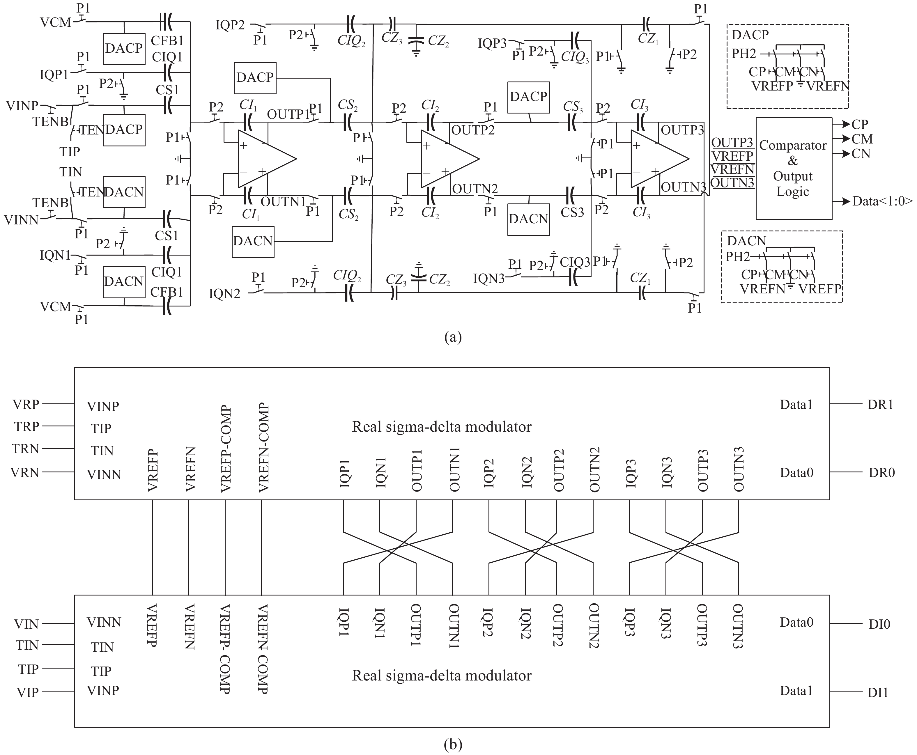 This paper presents the design and implementation of quadrature bandpass sigma–delta modulator. A pole movement method for transforming real sigma–delta modulator to a quadrature one is proposed by detailed study of the relationship of noise-shaping center frequency and integrator pole position in sigma–delta modulator. The proposed modulator uses sampling capacitor sharing switched capacitor integrator, and achieves a very small feedback coefficient by a series capacitor network, and those two techniques can dramatically reduce capacitor area. Quantizer output-dependent dummy capacitor load for reference voltage buffer can compensate signal-dependent noise that is caused by load variation. This paper designs a quadrature bandpass Sigma-Delta modulator for 2.4 GHz low IF receivers that achieve 69 dB SNDR at 1 MHz BW and ?1 MHz IF with 48 MHz clock. The chip is fabricated with SMIC 0.18 μm CMOS technology, it achieves a total power current of 2.1 mA, and the chip area is 0.48 mm2.