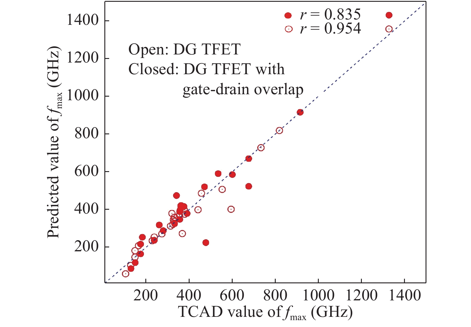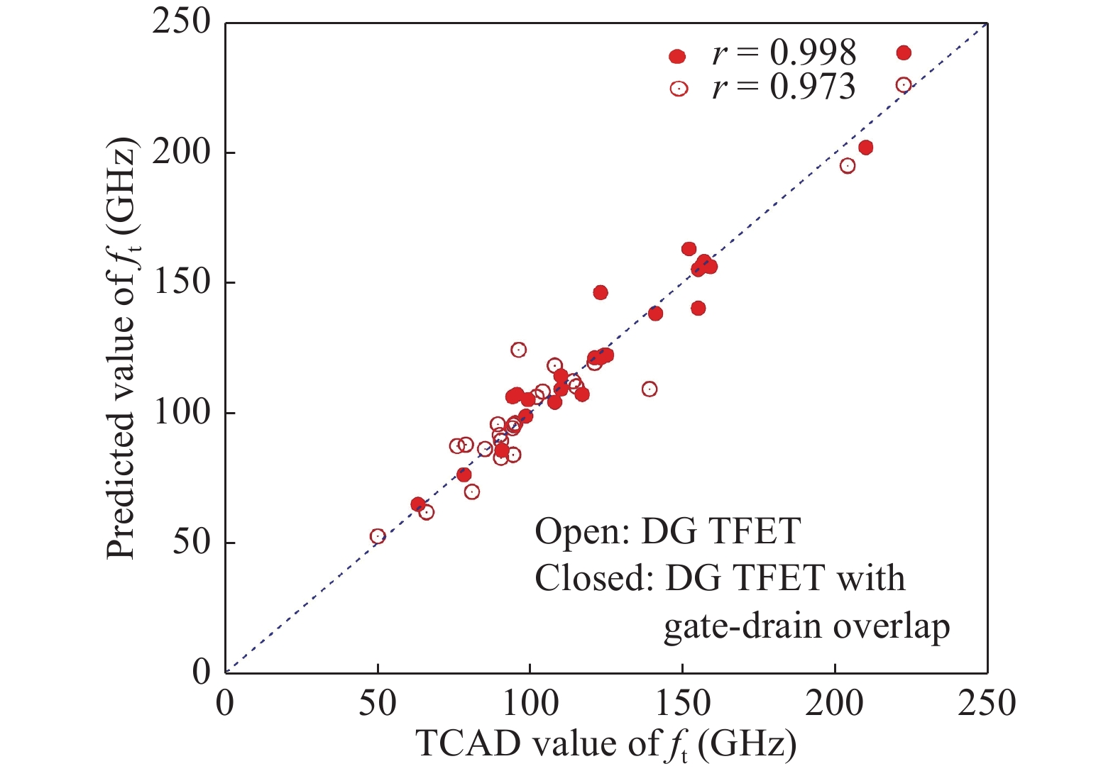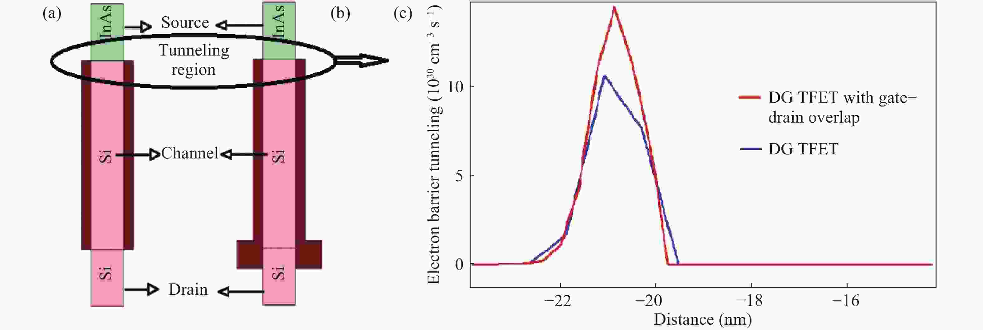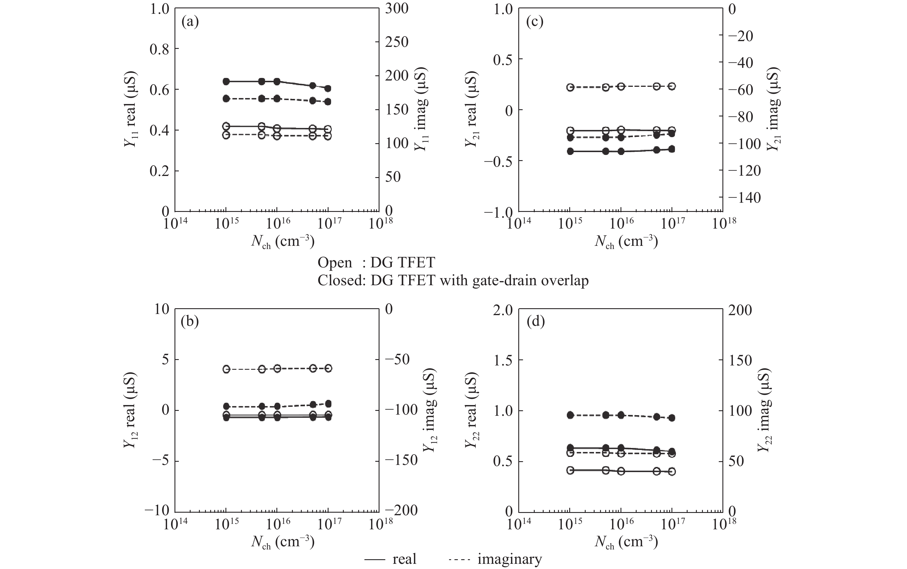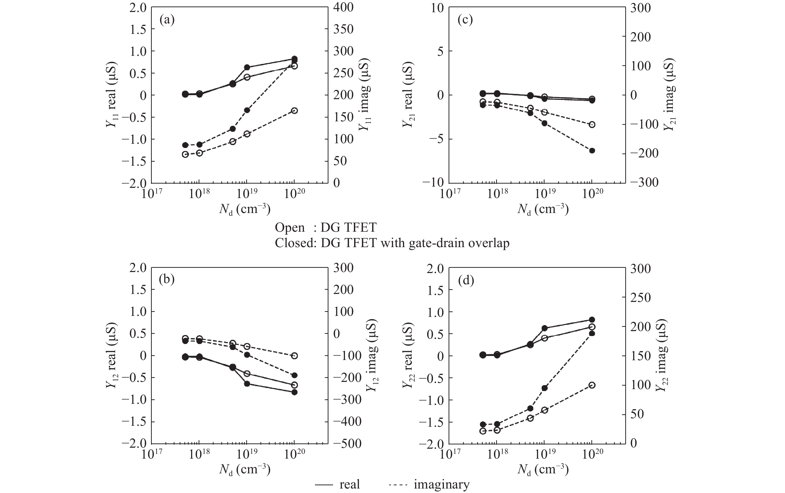 In this paper, RF performance analysis of InAs-based double gate (DG) tunnel field effect transistors (TFETs) is investigated in both qualitative and quantitative fashion. This investigation is carried out by varying the geometrical and doping parameters of TFETs to extract various RF parameters, unity gain cut-off frequency (ft), maximum oscillation frequency (fmax), intrinsic gain and admittance (Y) parameters. An asymmetric gate oxide is introduced in the gate-drain overlap and compared with that of DG TFETs. Higher ON-current (ION) of about 0.2 mA and less leakage current (IOFF) of 29 fA is achieved for DG TFET with gate-drain overlap. Due to increase in transconductance (gm), higher ft and intrinsic gain is attained for DG TFET with gate-drain overlap. Higher fmax of 985 GHz is obtained for drain doping of 5 × 1017 cm?3 because of the reduced gate-drain capacitance (Cgd) with DG TFET with gate-drain overlap. In terms of Y-parameters, gate oxide thickness variation offers better performance due to the reduced values of Cgd. A second order numerical polynomial model is generated for all the RF responses as a function of geometrical and doping parameters. The simulation results are compared with this numerical model where the predicted values match with the simulated values.