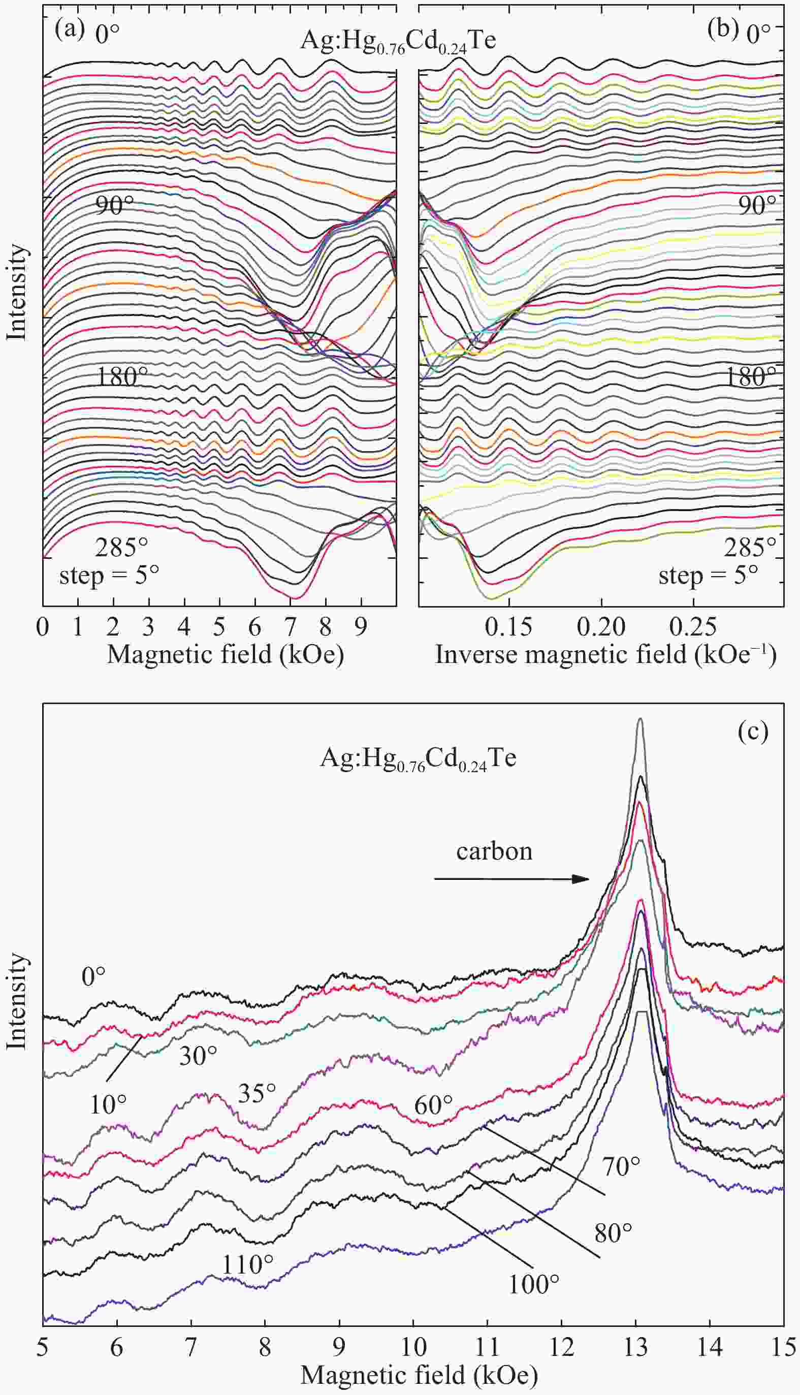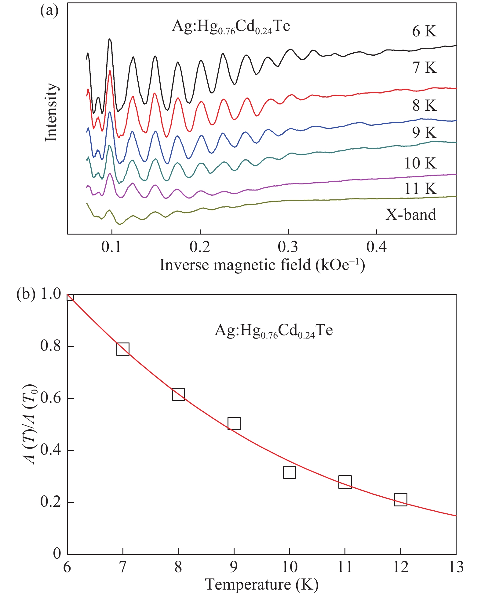 The objects of the investigation were uniformly Ag+ doped Hg0.76Cd0.24Te mercury chalcogenide monocrystals obtained by ion implantation with subsequent thermal annealing over 20 days. After implantation and annealing the conductivity was inverted from n-type with carrier concentration of 1016 cm?3 to p-type with carrier concentration of ≈ 3.9 × 1015 cm?3. The investigations of microwave absorption derivative (dP/dH) showed the existence of strong oscillations in the magnetic field for Ag:Hg0.76Cd0.24Te in the temperature range 4.2–12 K. The concentration and effective mass of charge carrier were determined from oscillation period and temperature dependency of oscillation amplitude. We suppose that this phenomenon is similar to the de Haas–van Alphen effect in weakly correlated electron system with imperfect nesting vector.
