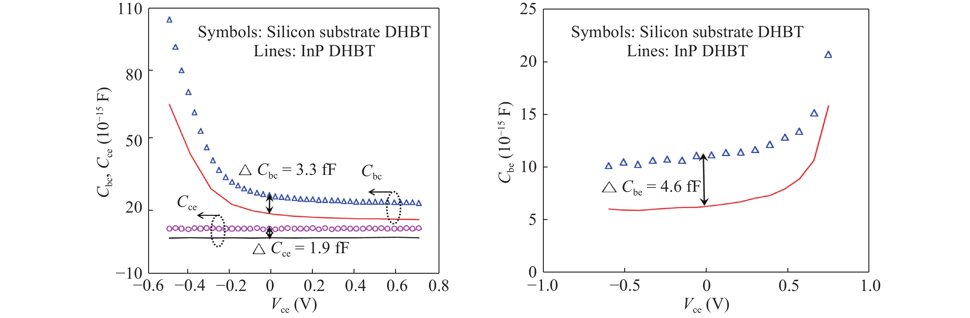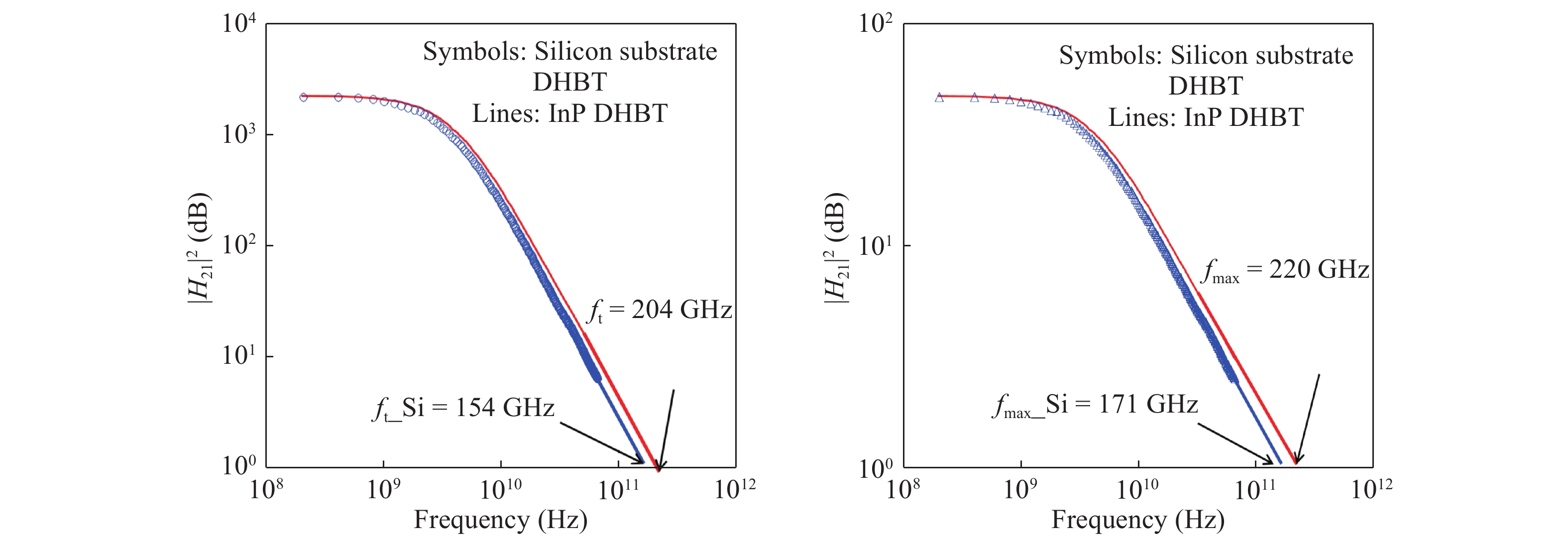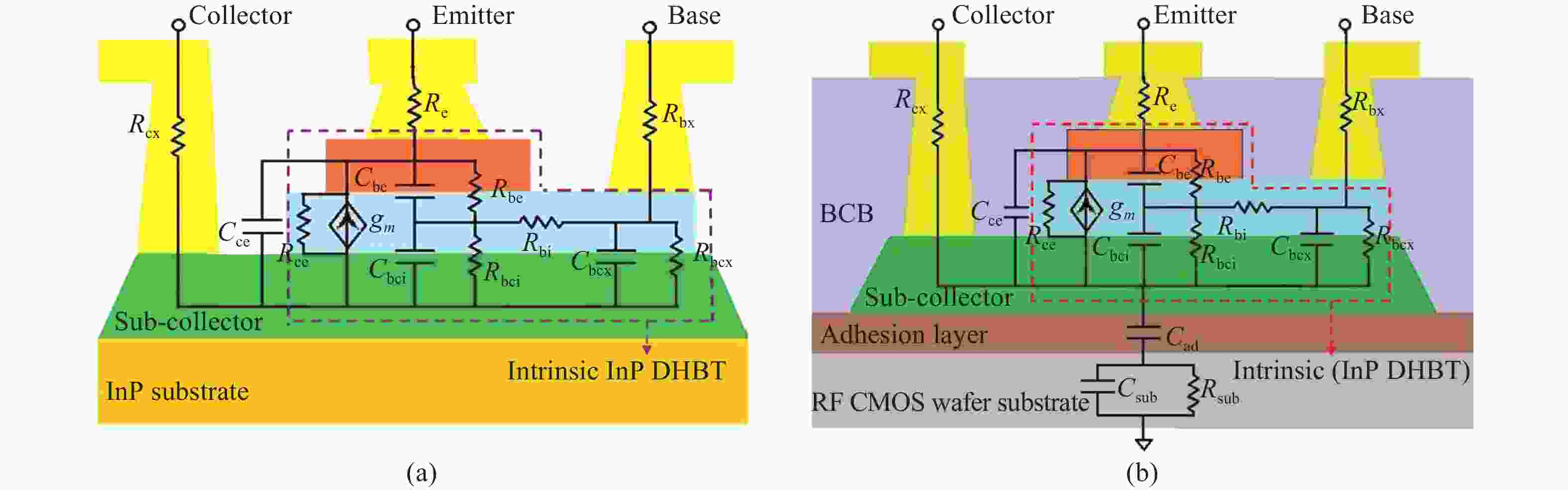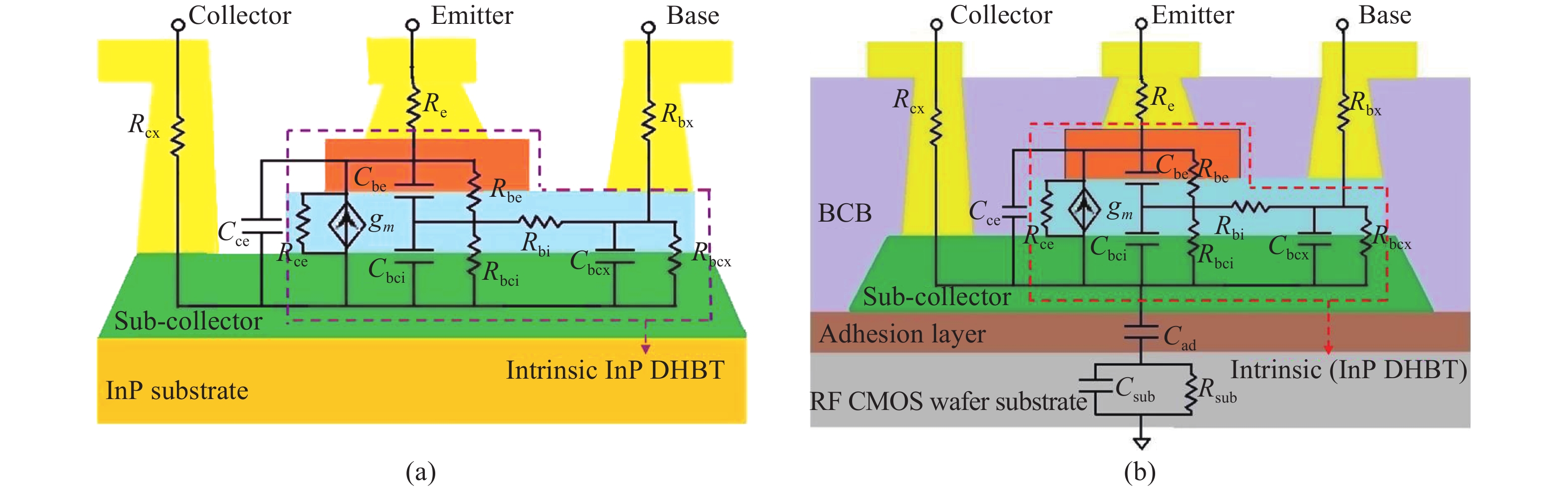 This paper investigated the DC and RF performance of the InP double heterojunction bipolar transistors (DHBTs) transferred to RF CMOS wafer substrate. The measurement results show that the maximum values of the DC current gain of a substrate transferred device had one emitter finger, of 0.8 μm in width and 5 μm in length, are changed unobviously, while the cut-off frequency and the maximum oscillation frequency are decreased from 220 to 171 GHz and from 204 to 154 GHz, respectively. In order to have a detailed insight on the degradation of the RF performance, small-signal models for the InP DHBT before and after substrate transferred are presented and comparably extracted. The extracted results show that the degradation of the RF performance of the device transferred to RF CMOS wafer substrate are mainly caused by the additional introduced substrate parasitics and the increase of the capacitive parasitics induced by the substrate transfer process itself.