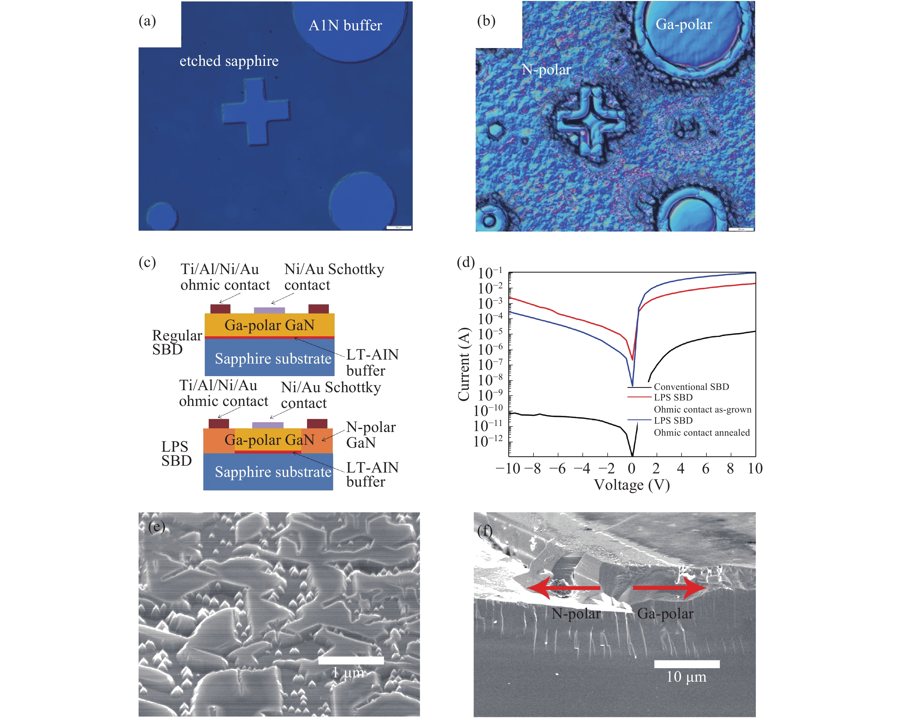 N-polar and III-polar GaN and AlN epitaxial thin films grown side by side on single sapphire substrate was reported. Surface morphology, wet etching susceptibility and bi-axial strain conditions were investigated and the polarity control scheme was utilized in the fabrication of Schottky barrier diode where ohmic contact and Schottky contact were deposited on N-polar domains and Ga-polar domains, respectively. The influence of N-polarity on on-state resistivity and I–V characteristic was discussed, demonstrating that lateral polarity structure of GaN and AlN can be widely used in new designs of optoelectronic and electronic devices.