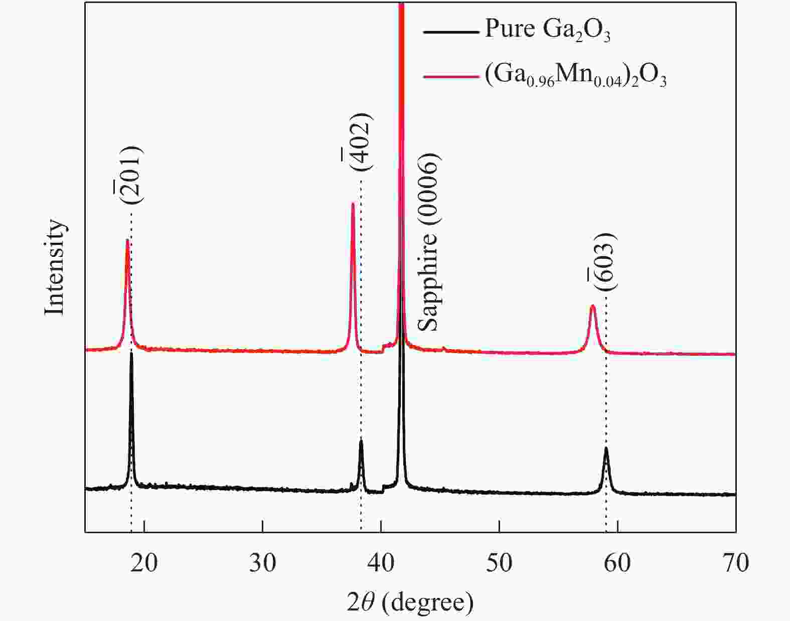 High quality epitaxial single phase (Ga0.96Mn0.04)2O3 and Ga2O3 thin films have been prepared on sapphire substrates by using laser molecular beam epitaxy (L-MBE). X-ray diffraction results indicate that the thin films have the monoclinic structure with a