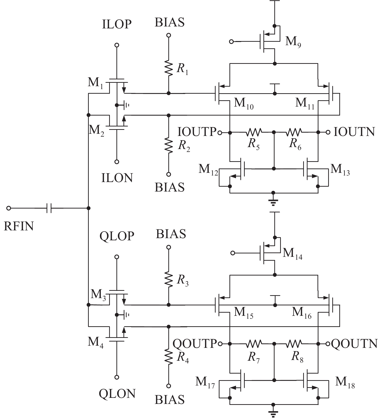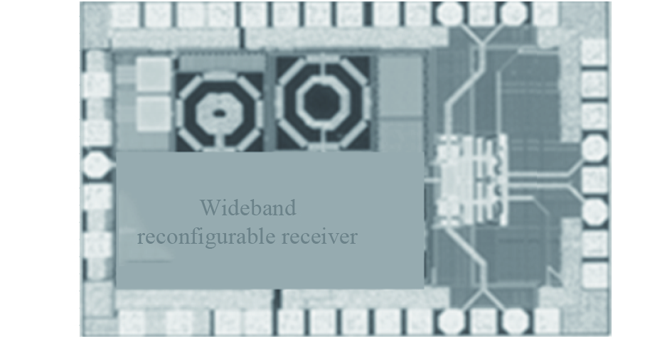 A 0.7–7 GHz wideband RF receiver front-end SoC is designed using the CMOS process. The front-end is composed of two main blocks: a single-ended wideband low noise amplifier (LNA) and an in-phase/quadrature (I/Q) voltage-driven passive mixer with IF amplifiers. Based on a self-biased resistive negative feedback topology, the LNA adopts shunt-peaking inductors and a gate inductor to boost the bandwidth. The passive down-conversion mixer includes two parts: passive switches and IF amplifiers. The measurement results show that the front-end works well at different LO frequencies, and this chip is reconfigurable among 0.7 to 7 GHz by tuning the LO frequency. The measured results under 2.5-GHz LO frequency show that the front-end SoC achieves a maximum conversion gain of 26 dB, a minimum noise figure (NF) of 3.2 dB, with an IF bandwidth of greater than 500 MHz. The chip area is 1.67 × 1.08 mm2.