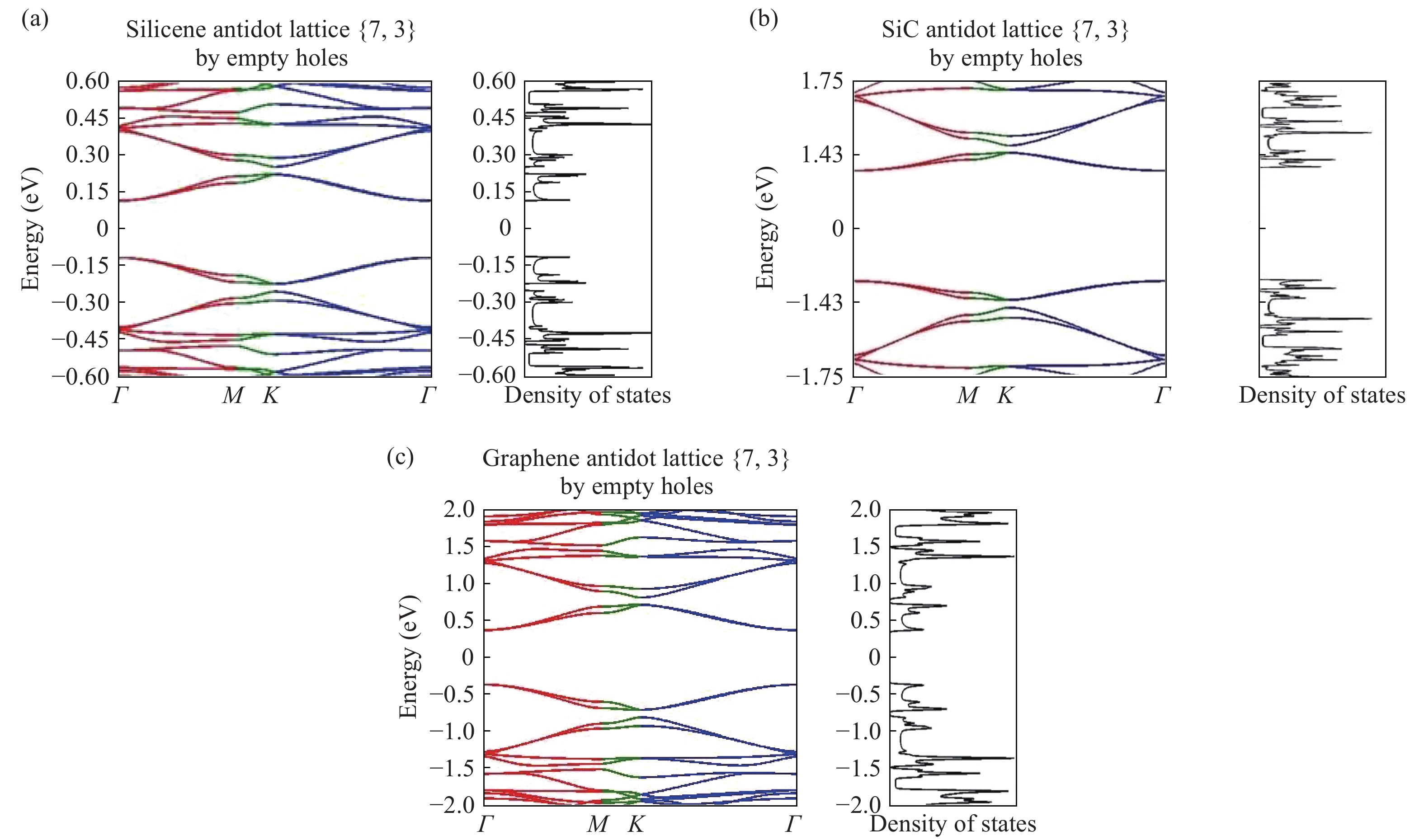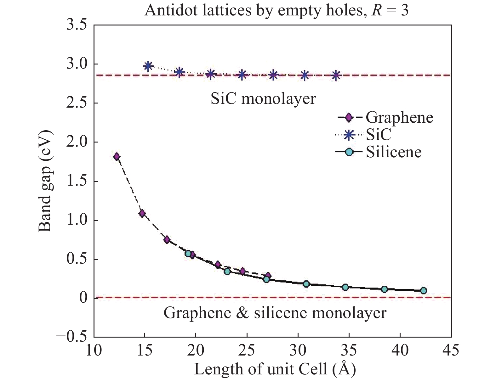 Band structure of monolayer of graphene, silicene and silicon-carbide including a lattice of empty or filled holes