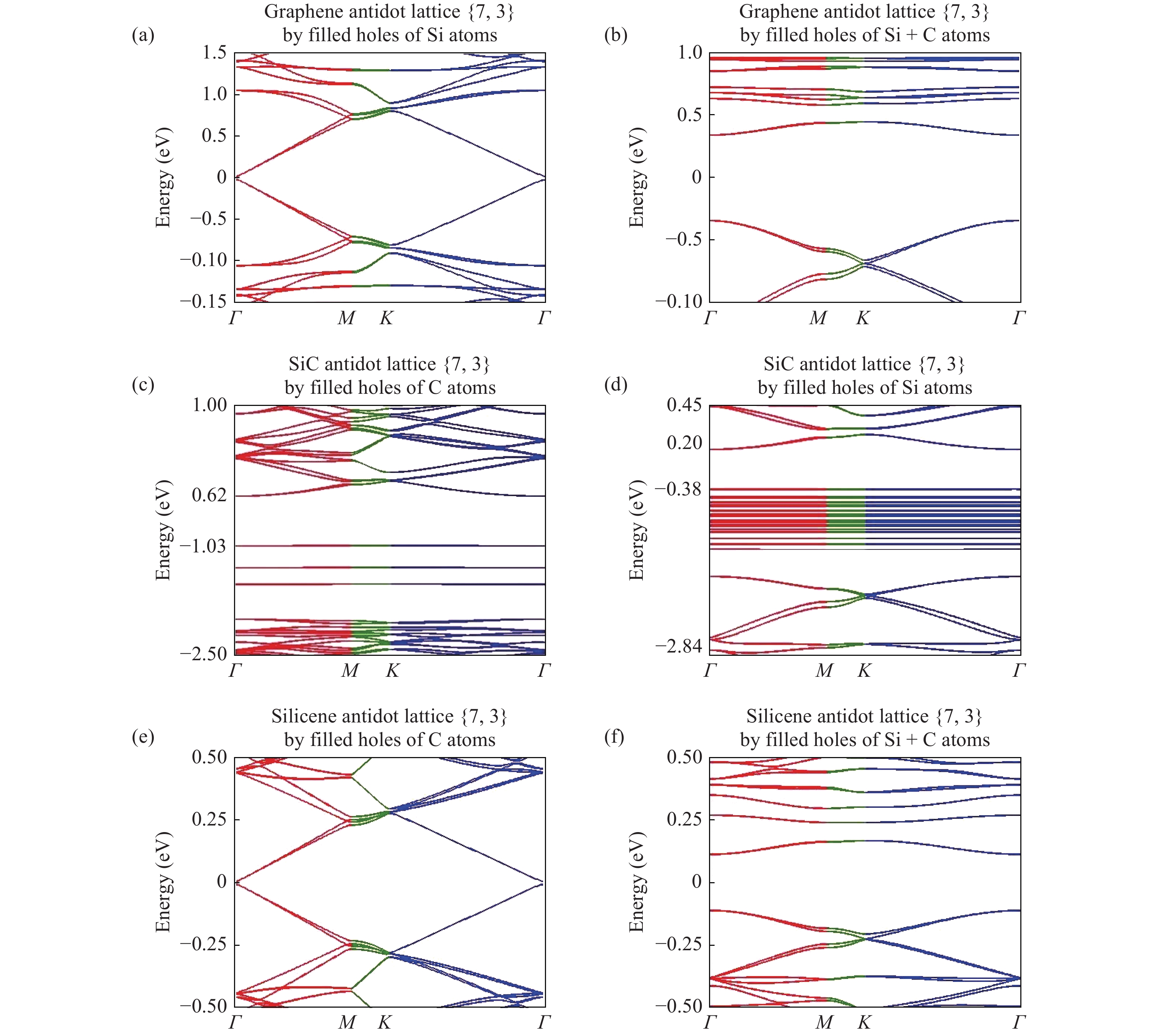 We have developed a $\pi$ -orbital tight-binding Hamiltonian model taking into account the nearest neighbors to study the effect of antidot lattices (two dimensional honeycomb lattice of atoms including holes) on the band structure of silicene and silicon carbide (SiC) sheets. We obtained that the band structure of the silicene antidot superlattice strongly depends on the size of embedded holes, and the band gap of the silicene antidot lattice increases by increasing of holes diameter. The band gap of SiC antidot lattice, except for the lattice of the small unit cell, is independent of the holes diameter and also depends on the distance between holes. We obtained that, the band gap of the SiC antidot lattice is the same as the band gap of the corresponding sheet without hole. Also, the electronic properties of the SiC antidot superlattice occupied either by carbon or by silicon atoms are investigated, numerically. Furthermore, we study the effect of occupation of graphene antidot by Si atoms and vice versa. Also, we have calculated the band structure of graphene and silicene antidot lattice filled by Si + C atoms. Finally, we compute the band structure of the SiC antidot lattice including the holes which are filled by C or by Si atoms. Really, in this paper we have generalized the method of paper[38] about graphene antidot with empty holes to the cases of filled holes by different atoms and also to the case of silicene and silicon carbide antidot lattices.