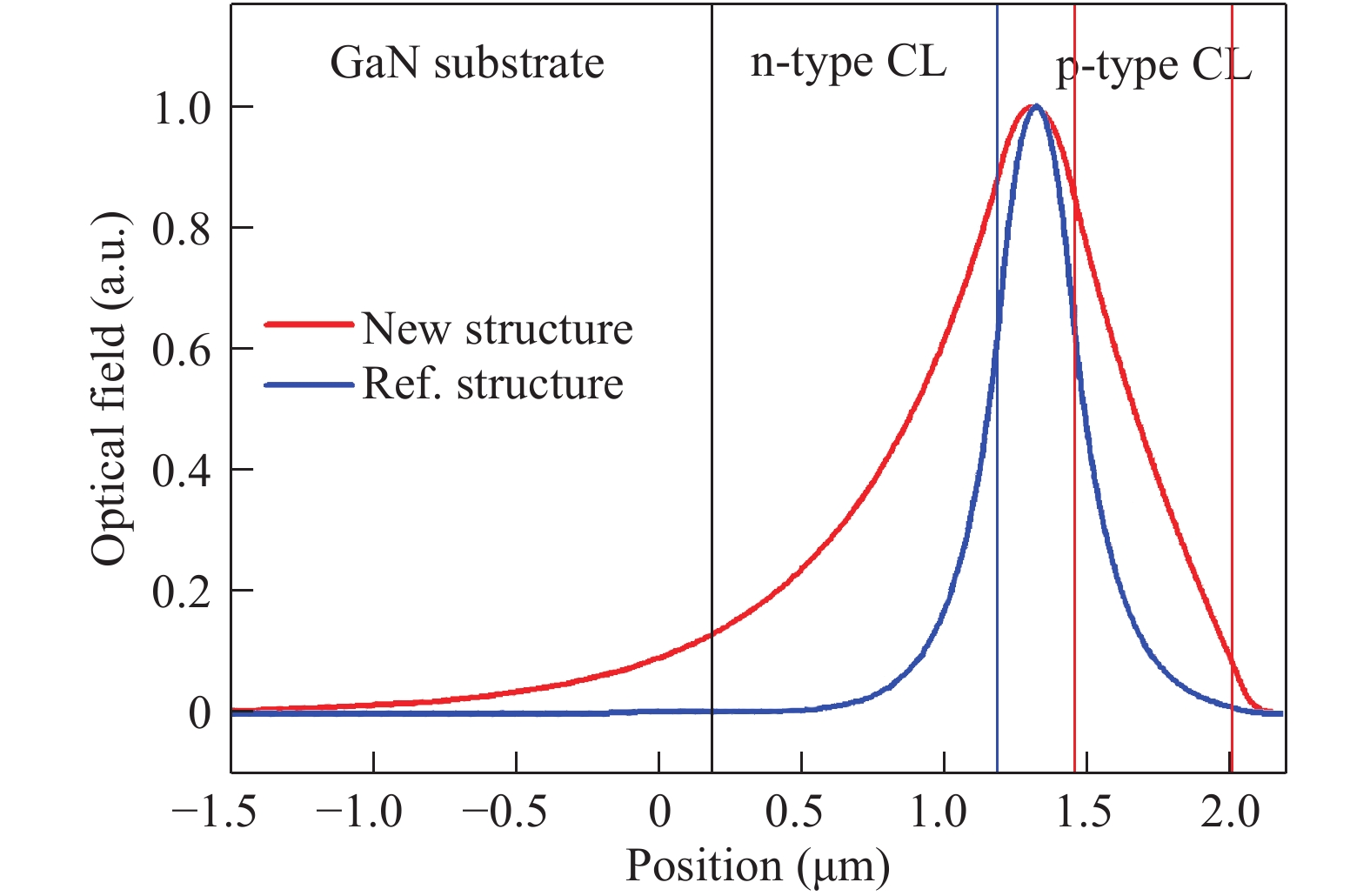 c-plane GaN-based blue laser diodes (LDs) were fabricated with Al-free cladding layers (CLs) and deepened etching depth of mesa structure, so the aspect ratio of the far-field pattern (FFP) of the laser beam can be reduced to as low as 1.7, which is nearly the same as conventional AlGaInP-based red LDs. By using GaN CLs, the radiation angle of the laser beam θ is only 10.1° in the direction perpendicular to the junction plane. After forming a deeply etched mesa, the beam divergence angle parallel to the junction plane of FFP, θ//, increases from 4.9° to 5.8°. After using the modified structure, the operation voltage of LD is effectively reduced by 2 V at an injection current of 50 mA, but the threshold current value increases. The etching damage may be one of the main reasons responsible for the increase of the threshold current.