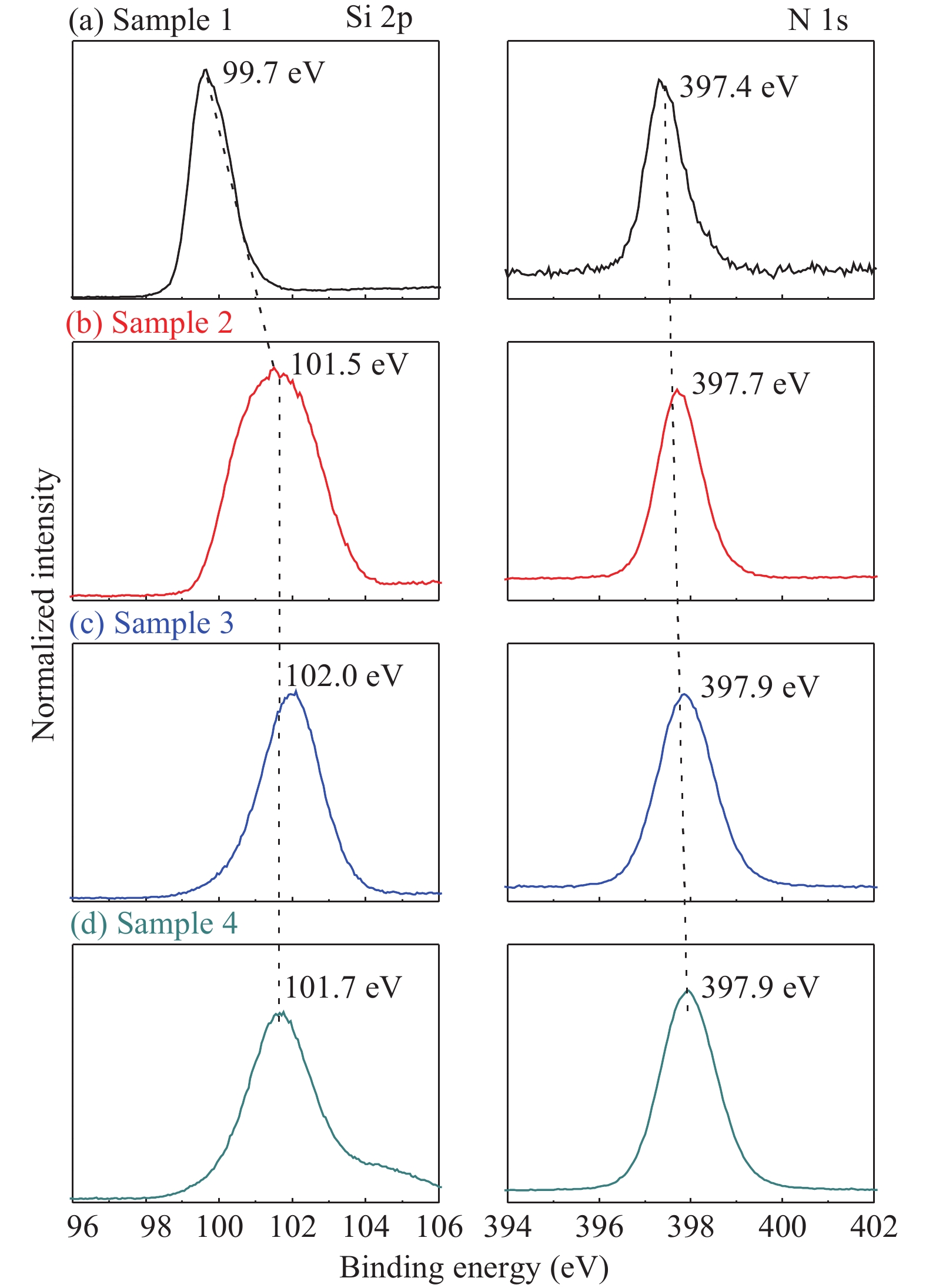 The surface and optical properties of silicon nitride samples with different compositions were investigated. The samples were deposited on InP by inductively coupled plasma chemical vapor deposition using different NH3 flow rates. Atomic force microscopy measurements show that the surface roughness is increased for the samples with both low and high NH3 flow rates. By optimization, when the NH3 flow rate is 6 sccm, a smooth surface with RMS roughness of 0.74 nm over a 5 × 5 μm2 area has been achieved. X-ray photoelectron spectroscopy measurements reveal the Si/N ratio of the samples as a function of NH3 flow rate. It is found that amorphous silicon is dominant in the samples with low NH3 flow rates, which is also proved in Raman measurements. The bonding energies of the Si and N atoms have been extracted and analyzed. Results show that the bonding states of Si atoms transfer from Si0 to Si+4 as the NH3 flow rate increases.